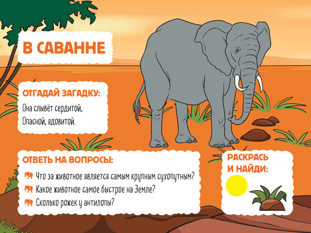 В-третьих, эта раскраска развивающая: на каждом развороте есть задания на внимание и мышление, стихотворные загадки и даже скрытые предметы, появляющиеся из ниоткуда!
