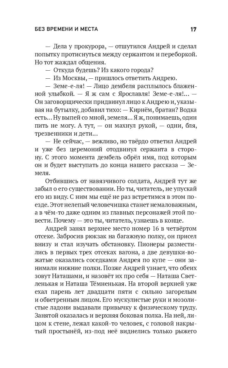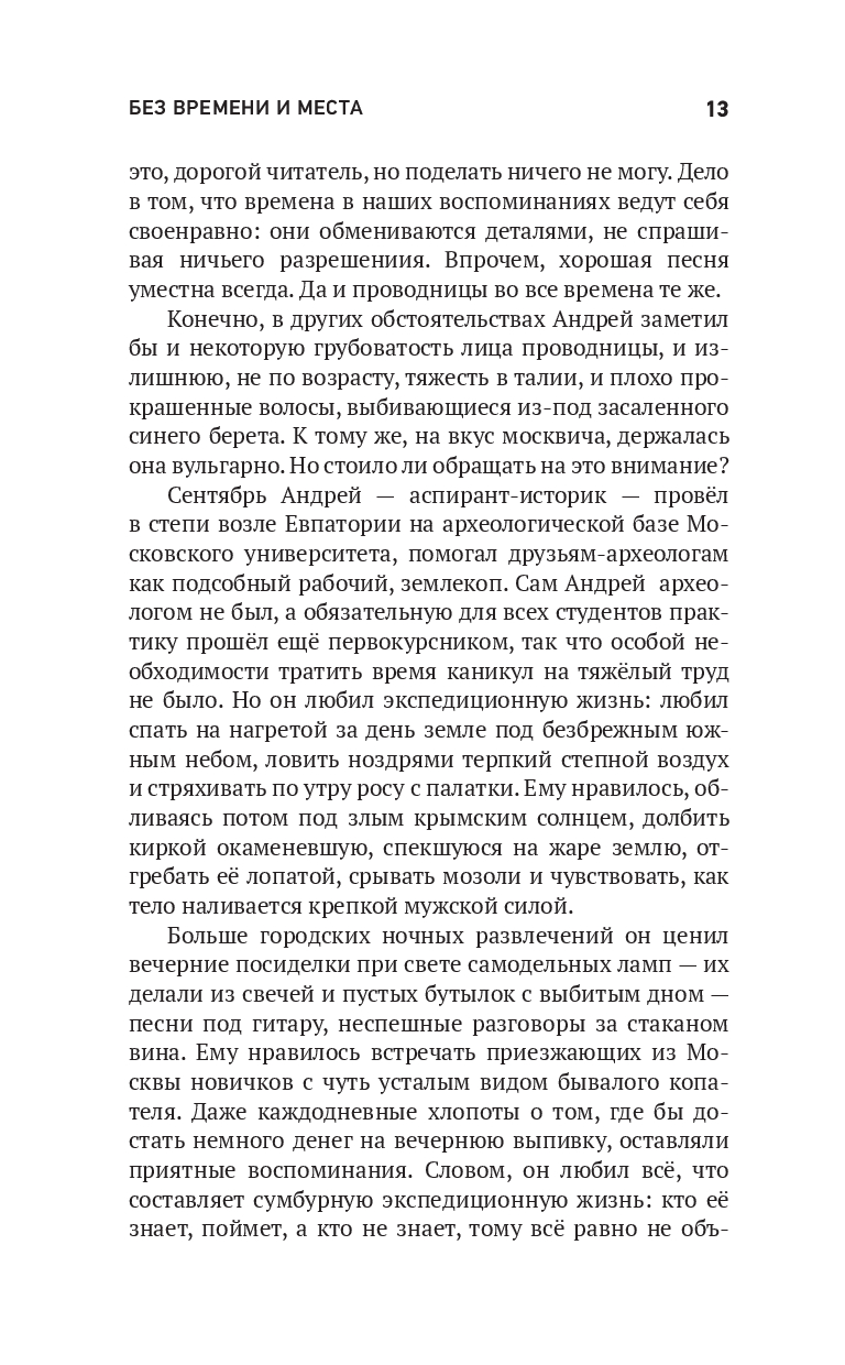 Повесть "Без времени и места" переносит читателя в 1982 год. С пассажирами обычного советского поезда случаются в пути не вполне обычные истории – забавные, драматические, курьёзные, загадочные и даже мистические. Только на последних страницах читатель узнает, кто виновник всех передряг и каким образом эти отдельные истории связаны между собой.