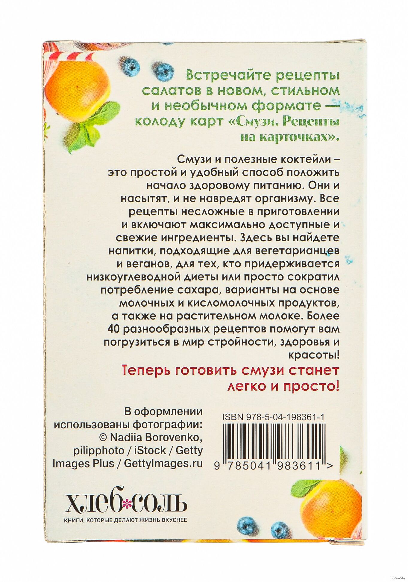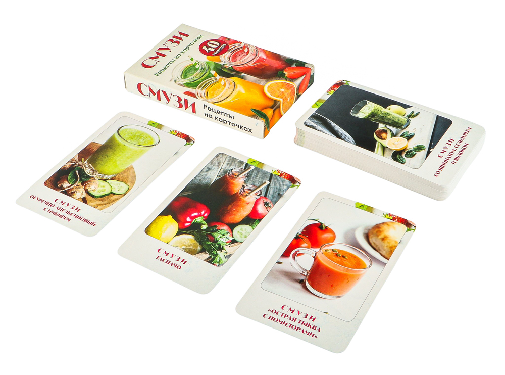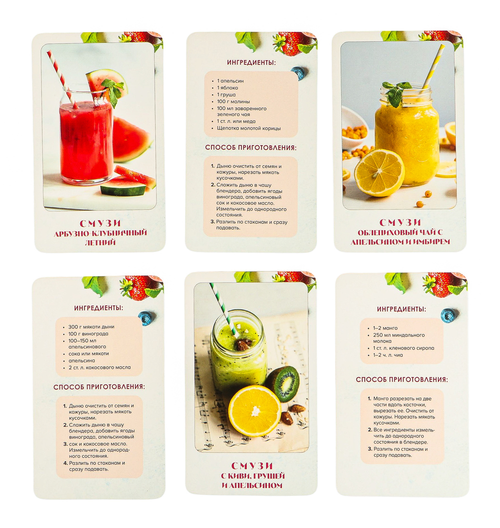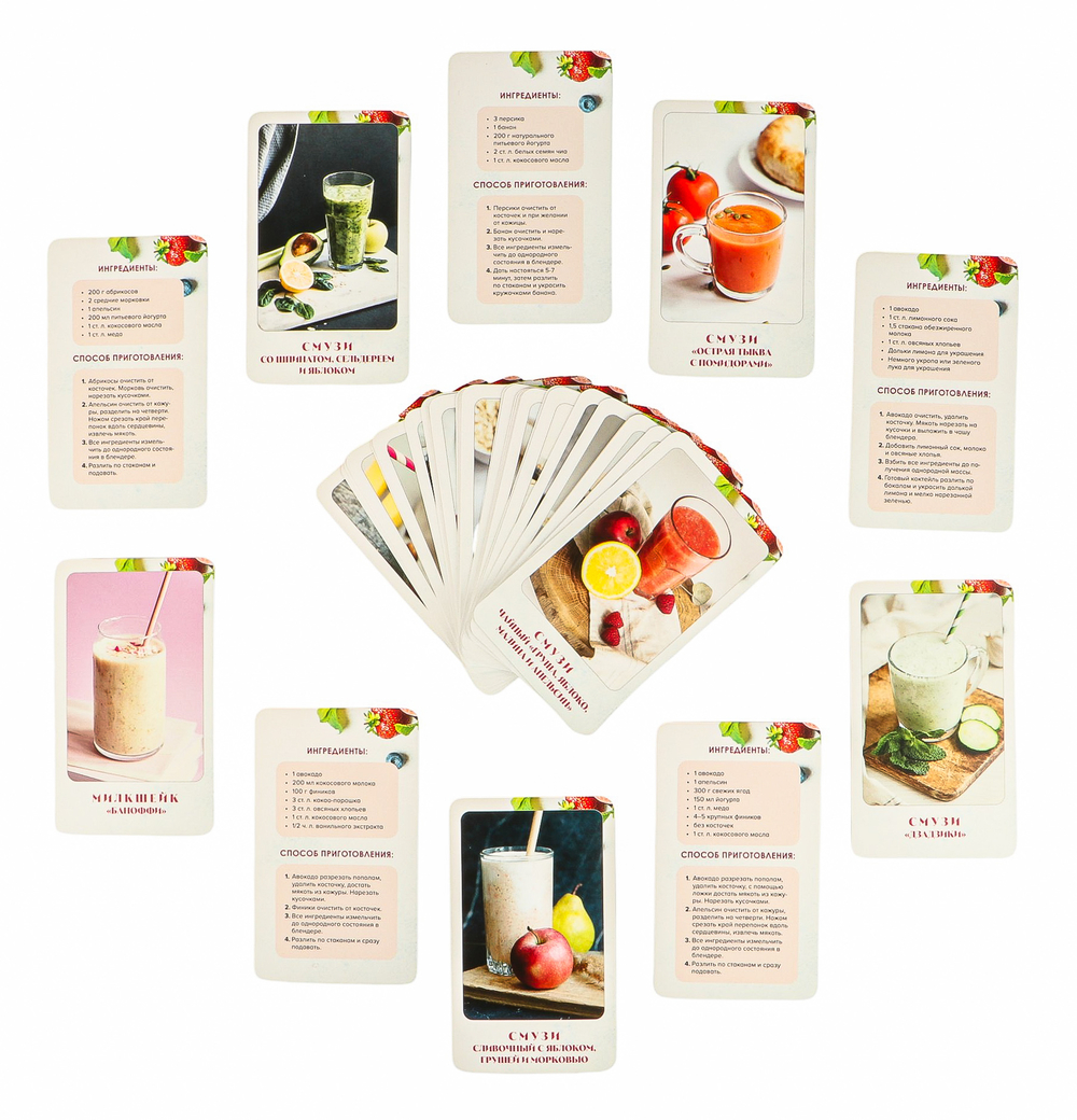 В этой колоде кулинарных карт вы найдете как рецепты смузи, так и необычные коктейли, которые насытят, и не навредят организму. Простые и проверенные рецепты не отнимут много времени и не вызовут сложностей: пошаговые инструкции помогут вам приготовить вкусные смузи и коктейли с первой попытки. Вдохновляйтесь нашими рекомендациями и создавайте кулинарные шедевры, которые порадуют вас и ваших близких!