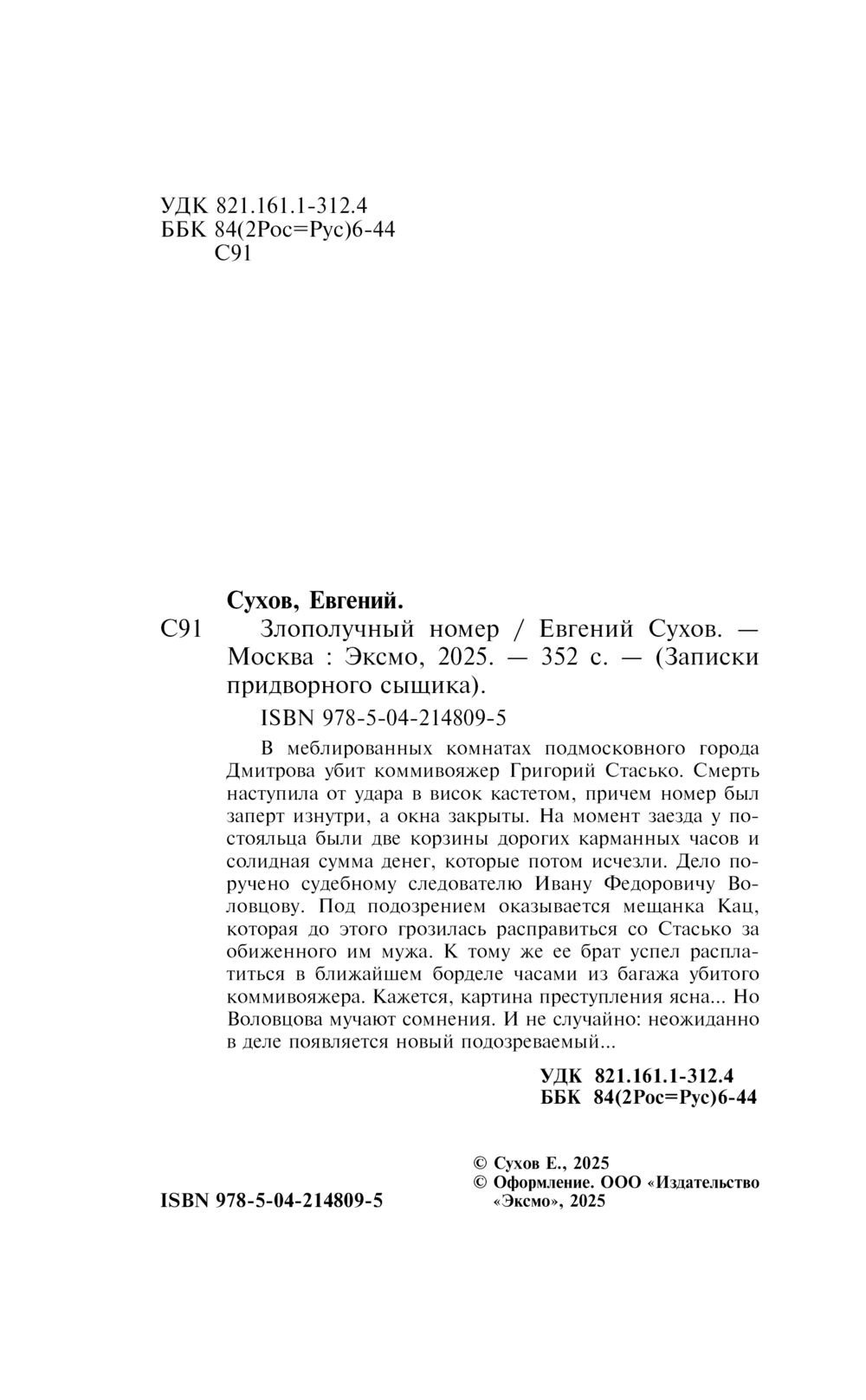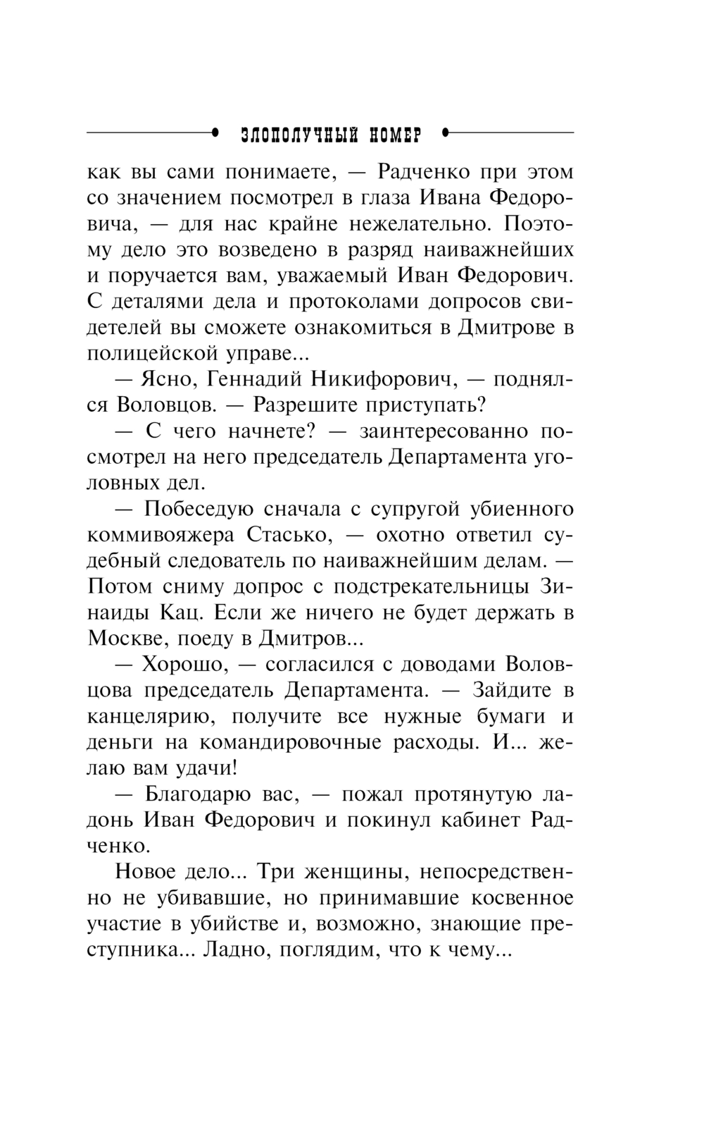 В меблированных комнатах подмосковного города Дмитрова убит коммивояжер Григорий Стасько. Смерть наступила от удара в висок кастетом, причем номер был заперт изнутри, а окна закрыты. На момент заезда у постояльца были две корзины дорогих карманных часов и солидная сумма денег, которые потом исчезли. Дело поручено судебному следователю Ивану Федоровичу Воловцову. Под подозрением оказывается мещанка Кац, которая до этого грозилась расправиться со Стасько за обиженного им мужа. К тому же, ее брат успел расплатиться в ближайшем борделе часами из багажа убитого коммивояжера. Кажется, картина преступления ясна… Но Воловцова мучают сомнения. И не случайно: неожиданно в деле появляется новый подозреваемый…
