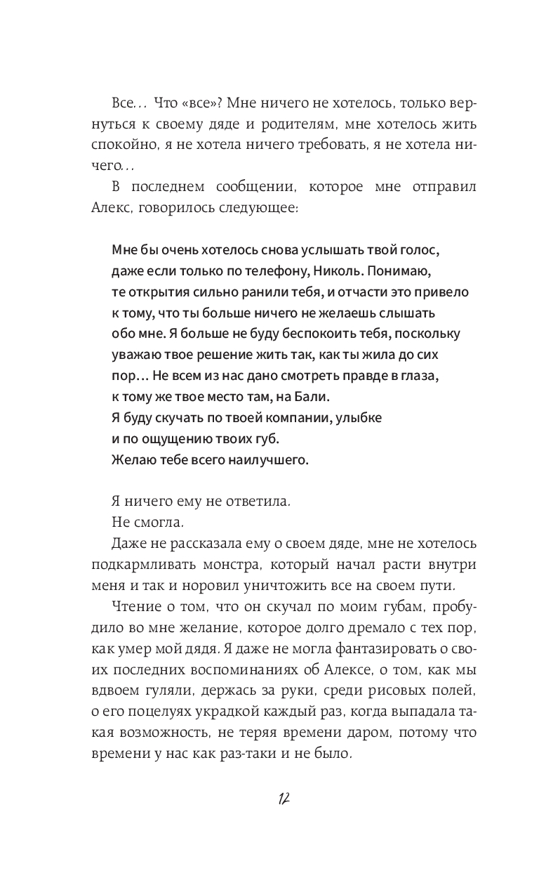 Никки жила мирной островной жизнью на Бали... пока не появился Алекс. Алекс никогда не думал, что сможет почувствовать такую глубокую связь... пока не встретил Никки. Она раскрыла секреты из своего прошлого, которые могут изменить все. Ему придется столкнуться с тем, что существуют миры, которые никогда не смогут пересечься. Установив целый океан дистанции друг от друга, Алекс и Никки обнаружат, что не так-то просто оставаться порознь, особенно когда их влечение сопряжено с опасностью, которая может положить конец всему, даже их жизни. Что Алекс прячет в Лондоне? Какова реальная история семьи Никки? Есть ли у страсти предел?