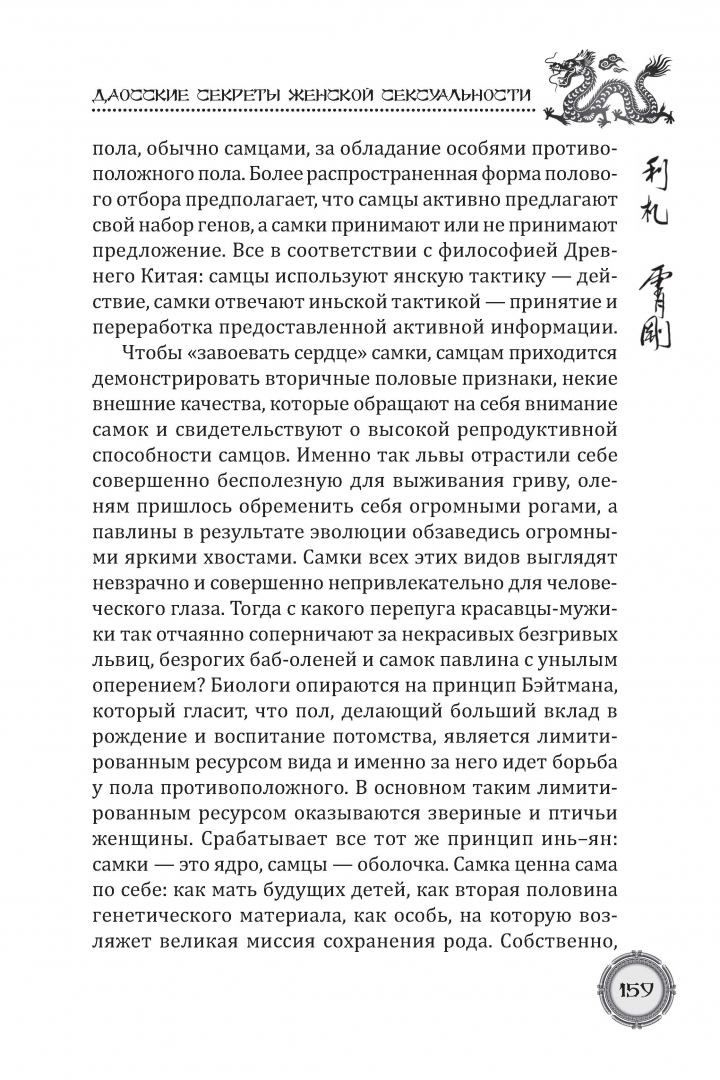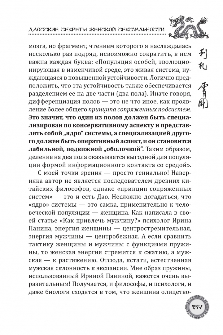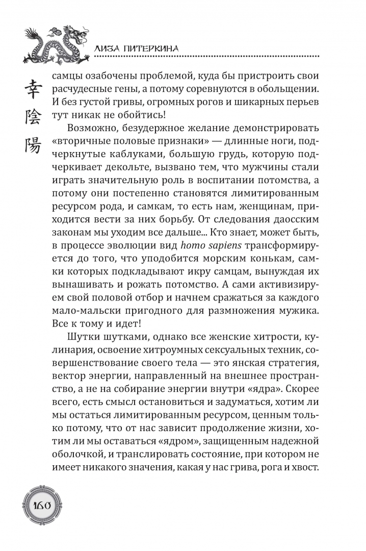 "Самых высоких результатов чувственности и сексуальности можно добиться не с помощью действий, а посредством мудрого бездействия, глубочайшей работы со своей эмоциональной сферой и повышения осознанности. Именно такой необычный путь предлагает мой учитель, Мастер Цзи. А я, в свою очередь, хотела бы передать это сакральное даосское знание тебе" (Лиза Питеркина).
