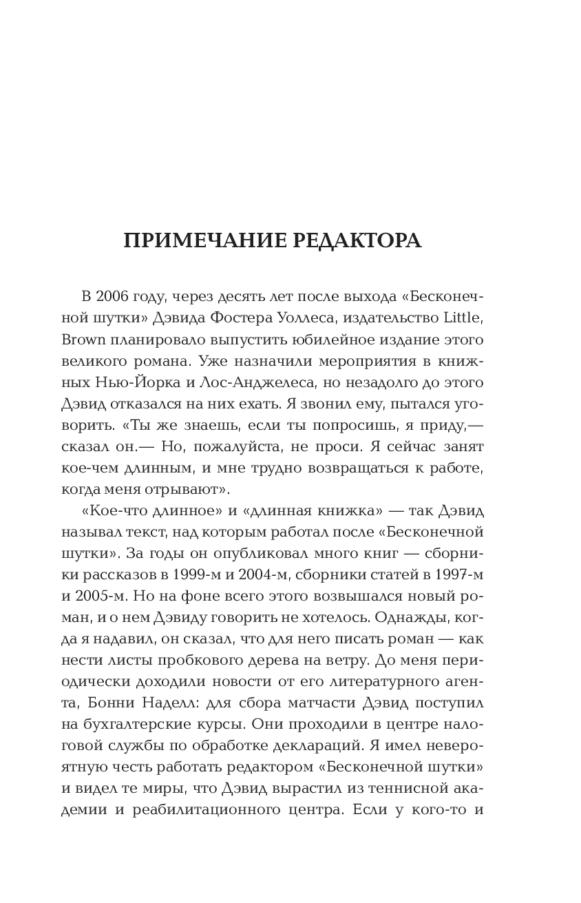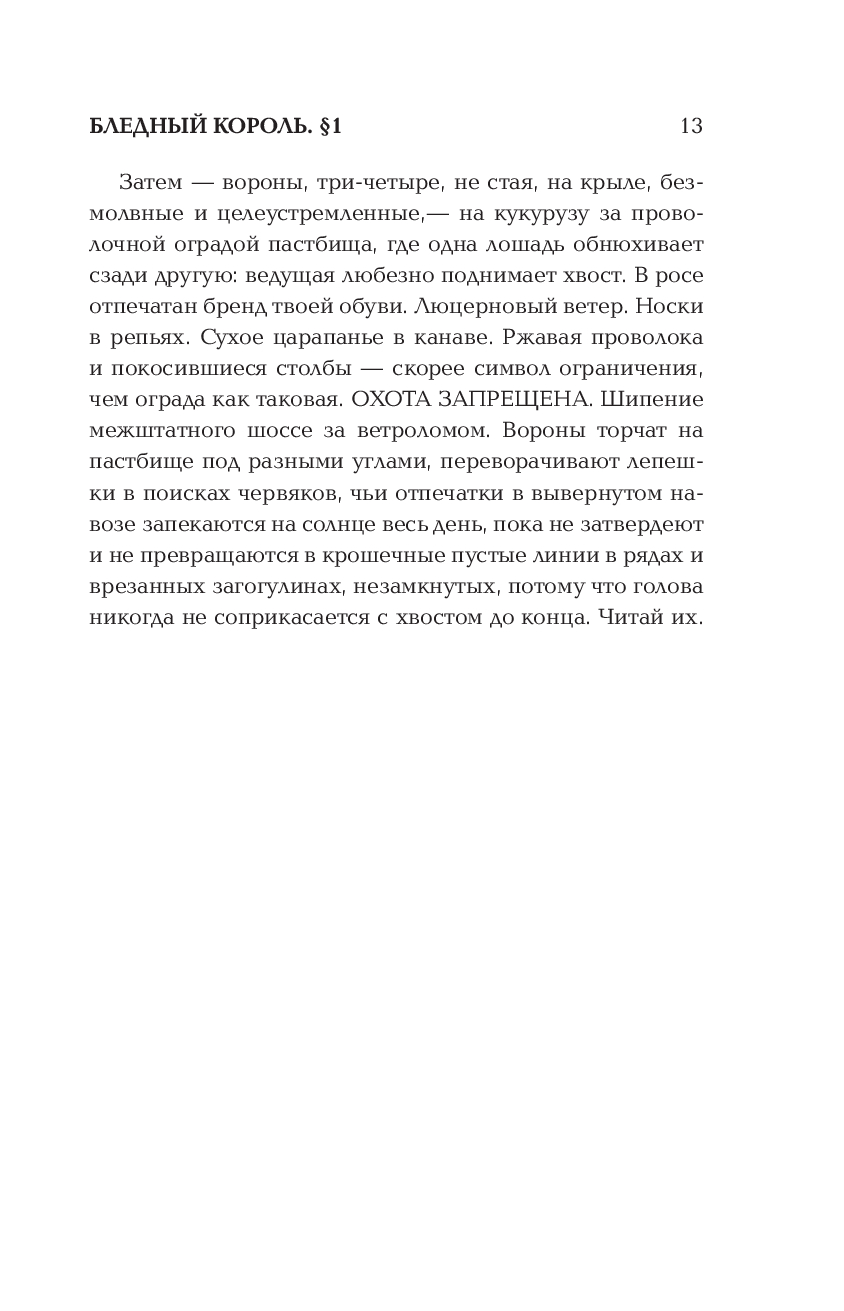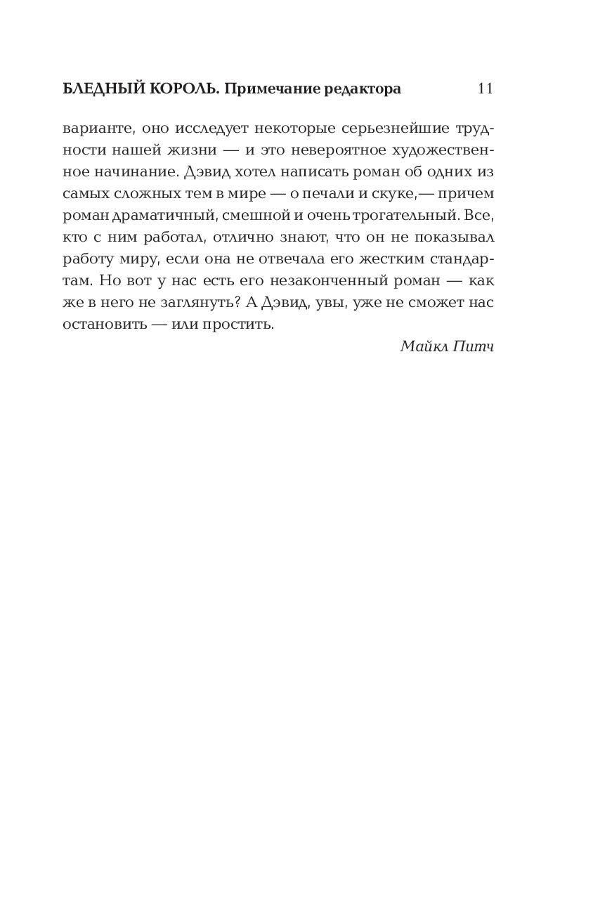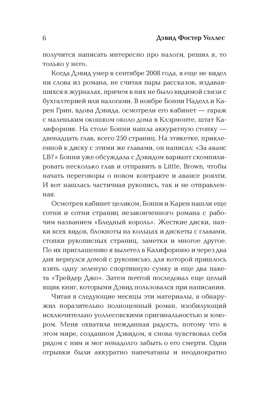 "Бледный король" остался незавершенным из-за безвременной смерти писателя, но это увлекательный, неожиданный и совершенно бесстрашный текст, находящийся на одном уровне с "Бесконечной шуткой" и "Короткими интервью с подонками". Неповторимый стиль, галерея по-настоящему необычных и ни на кого не похожих персонажей, вопросы о смысле жизни человека и о цене работы в обществе, характерные сложность и юмор – все это последняя книга Дэвида Фостера Уоллеса.