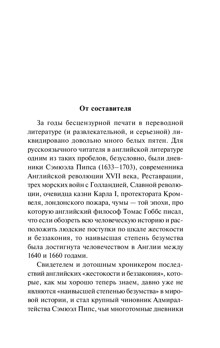 Его дневниковые записи составили цикл из одиннадцати томов, а в это издание вошла подборка избранных мест, которая поможет читателям получить полное представление о буднях, быте и нравах самых разных слоев английского общества XVII века.