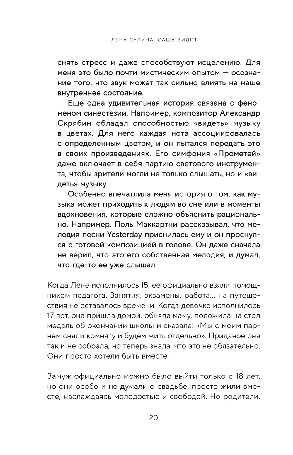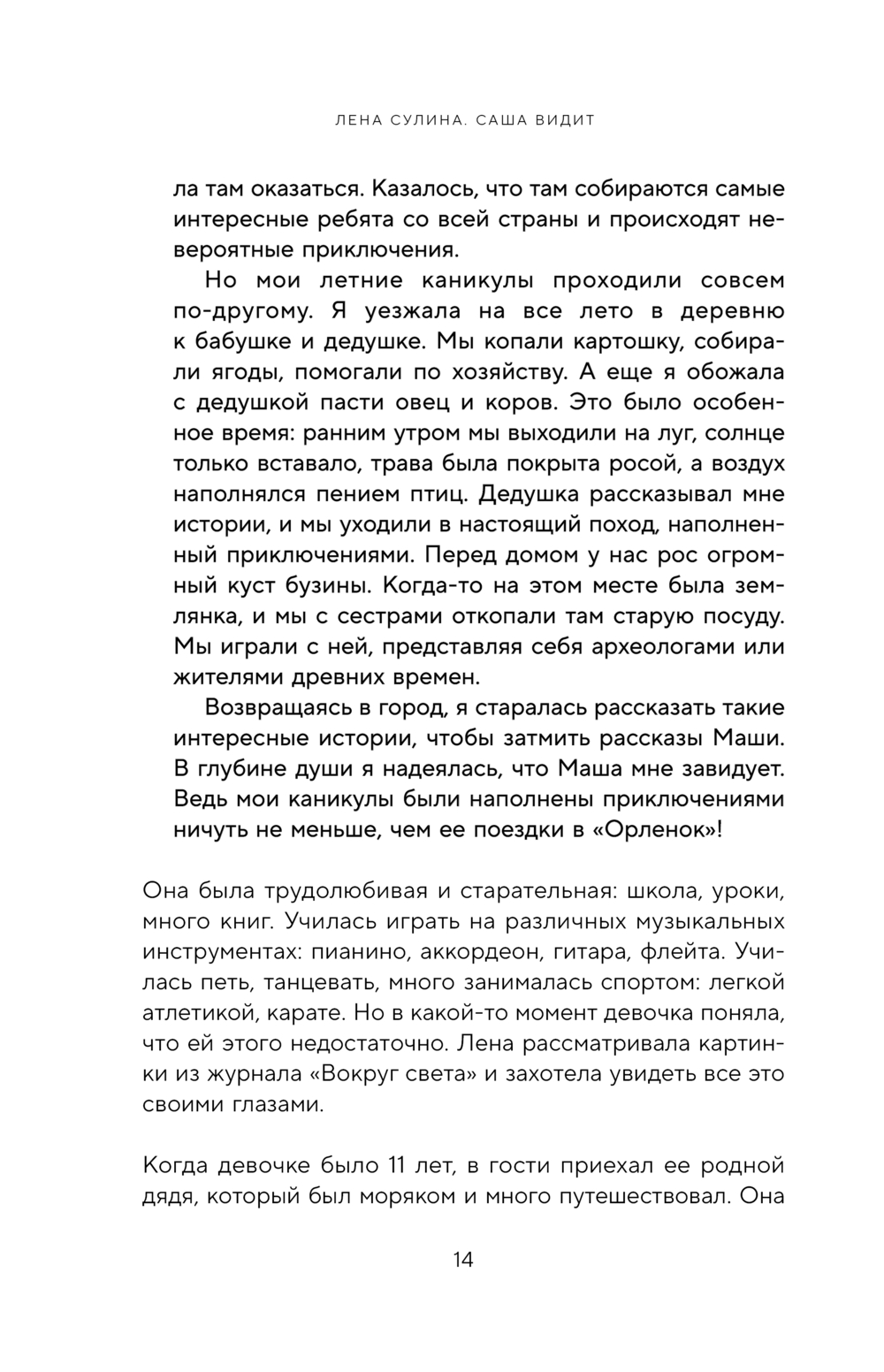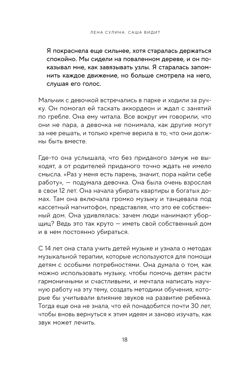 "Саша видит" – это удивительная история матери и сына, их поисков, преодоления и глубокого осознания жизни, в которой мама Лена делится своими открытиями, а мальчик Саша – мудростью, выходящей за границы привычного восприятия. Автор книги Лена Сулина – психотерапевт, коуч, предприниматель. Создатель семейного психологического центра и реабилитационного центра для детей с особенностями.