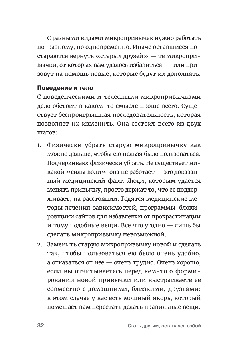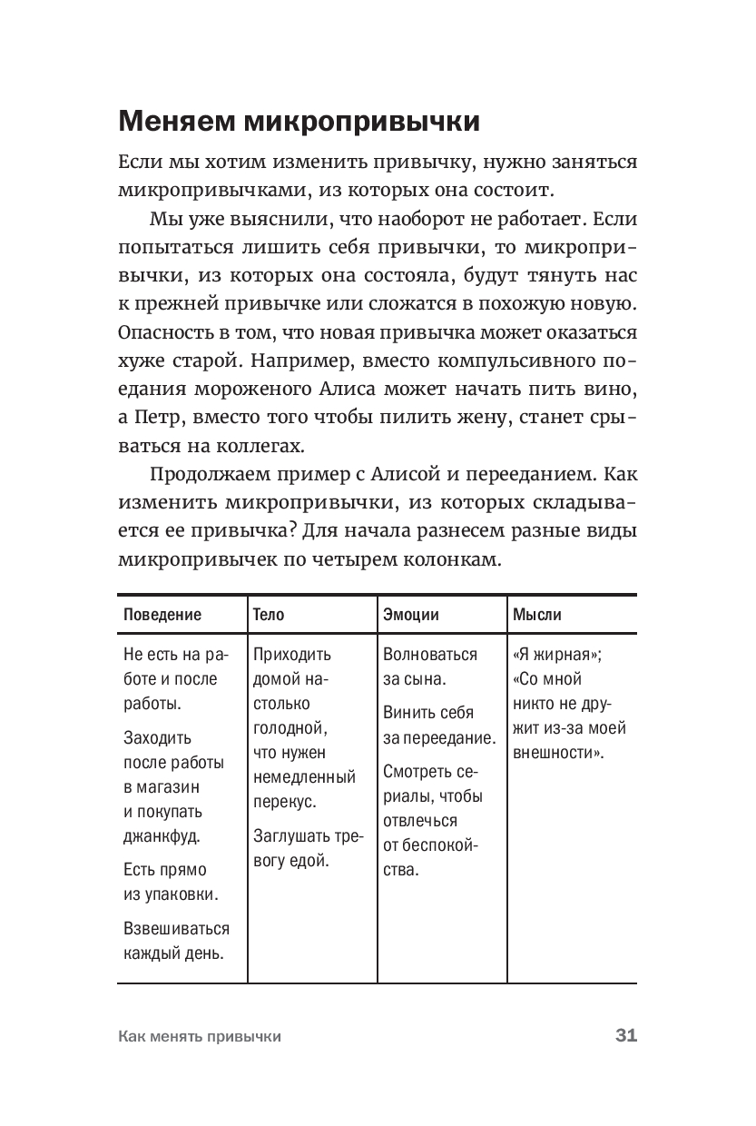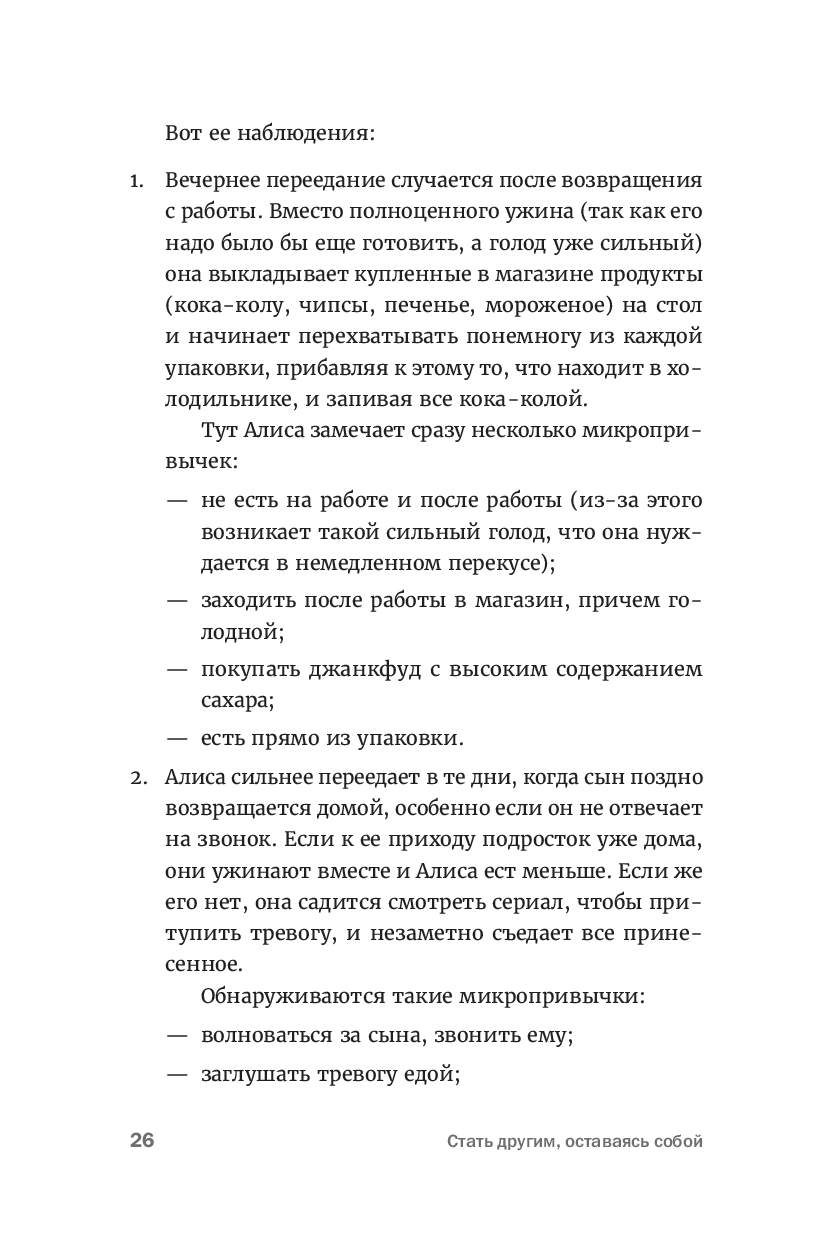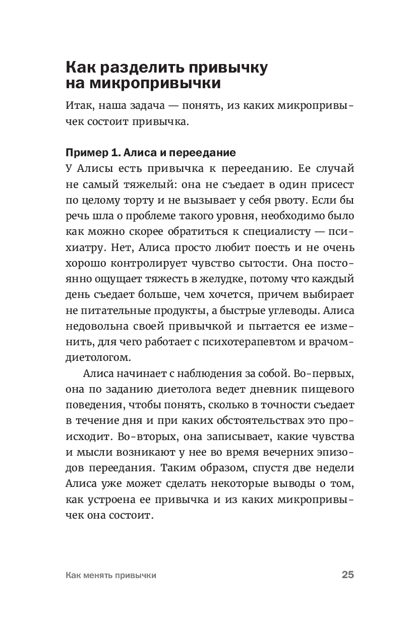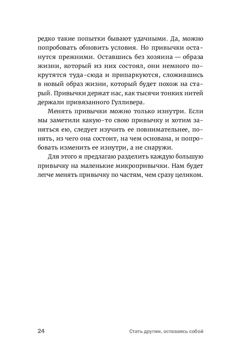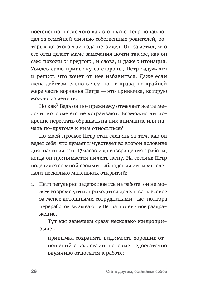 Автор считает, что для эффективного изменения любой привычки необходимо разделить ее на более мелкие "микропривычки" и работать с каждой из них. Кроль предлагает конкретные стратегии: от простых изменений в поведении до сложной работы с эмоциями и мыслительными паттернами. На примерах из реальной практики автор демонстрирует, как применять свой подход, помогая читателю не только изменить конкретные привычки, но и стать более гибким, открытым к новому опыту и способным управлять своей жизнью.