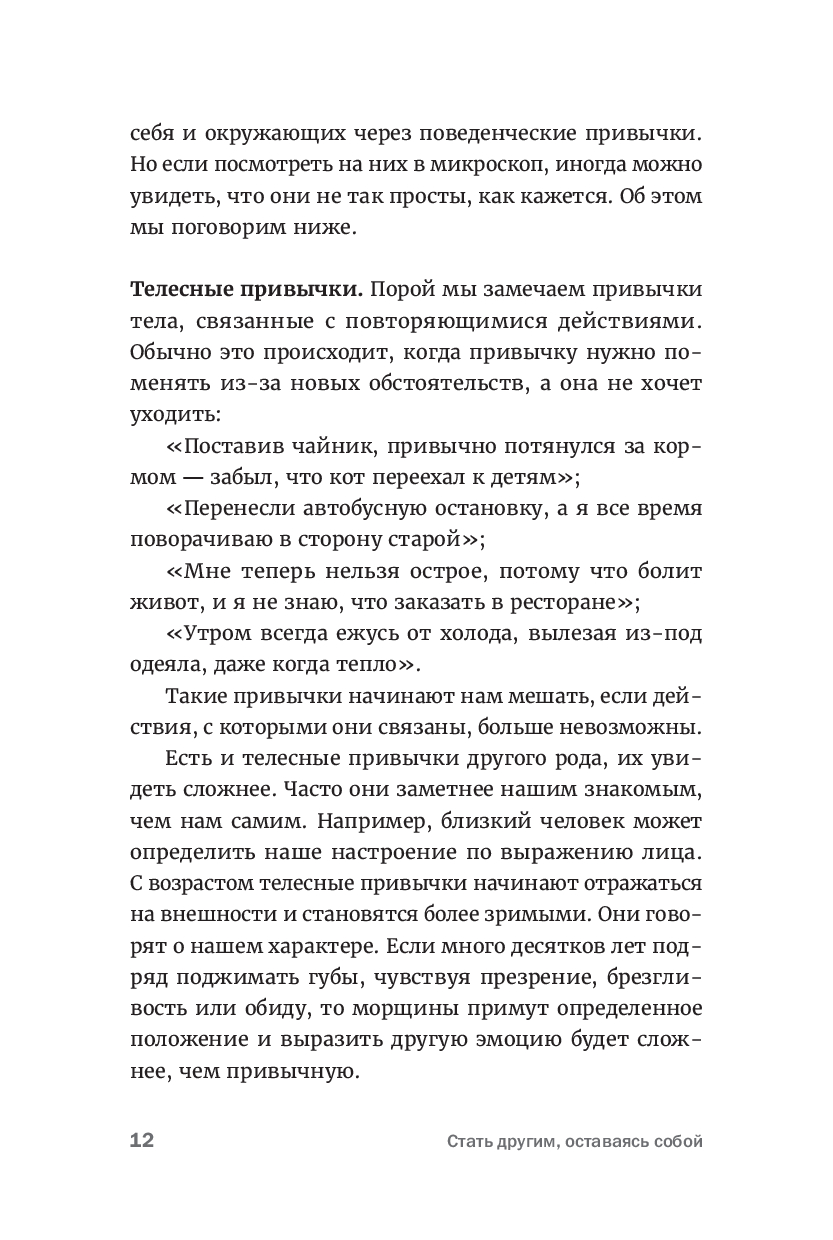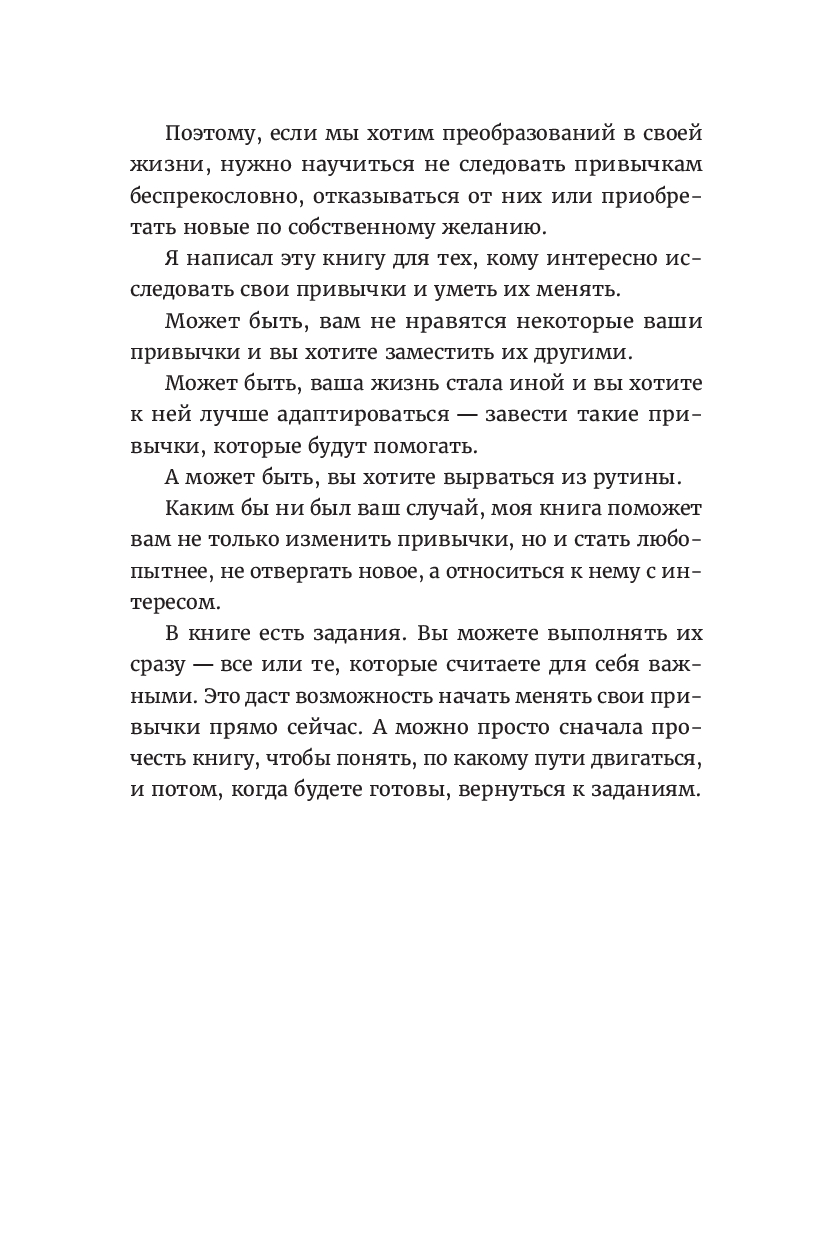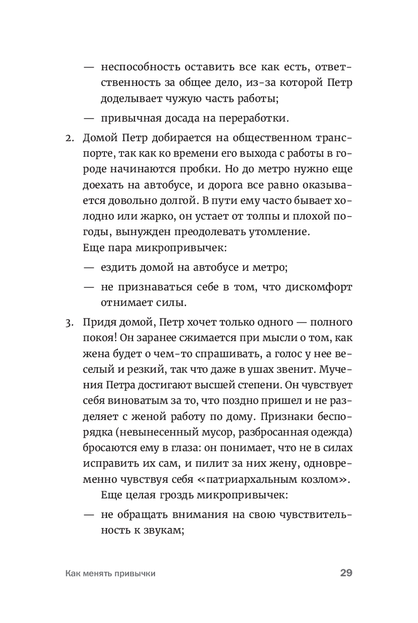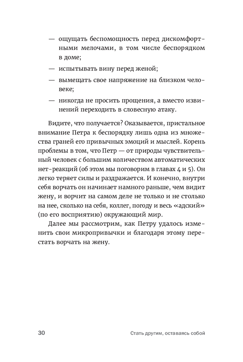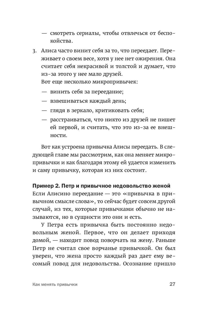 Автор считает, что для эффективного изменения любой привычки необходимо разделить ее на более мелкие "микропривычки" и работать с каждой из них. Кроль предлагает конкретные стратегии: от простых изменений в поведении до сложной работы с эмоциями и мыслительными паттернами. На примерах из реальной практики автор демонстрирует, как применять свой подход, помогая читателю не только изменить конкретные привычки, но и стать более гибким, открытым к новому опыту и способным управлять своей жизнью.