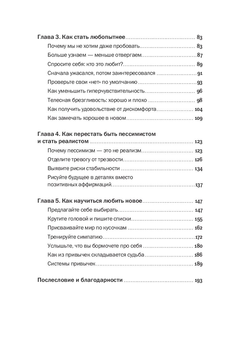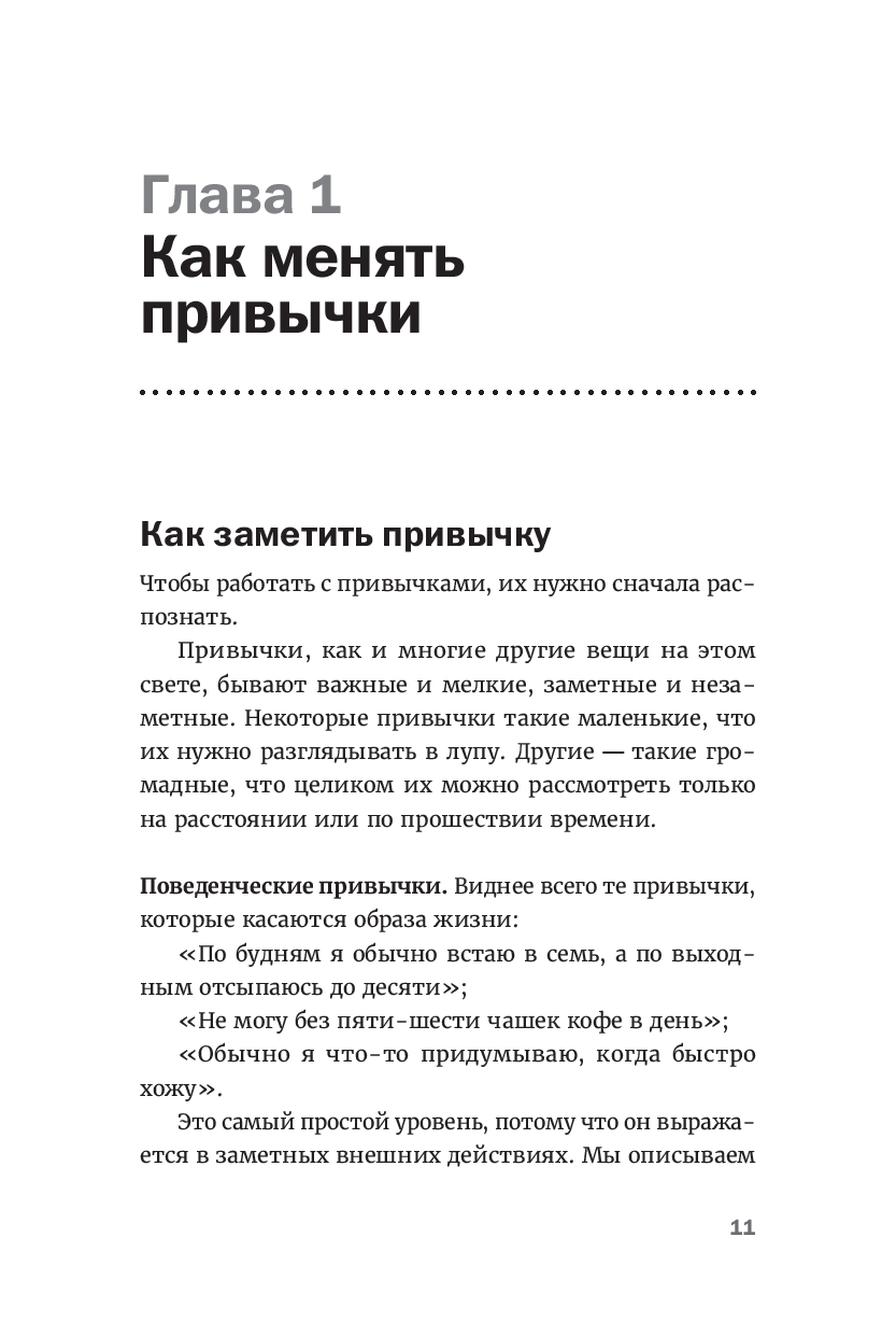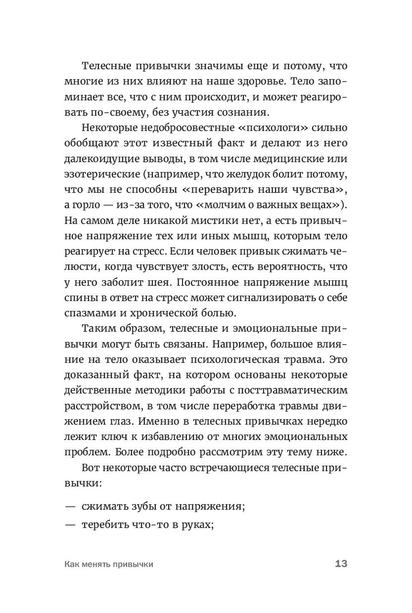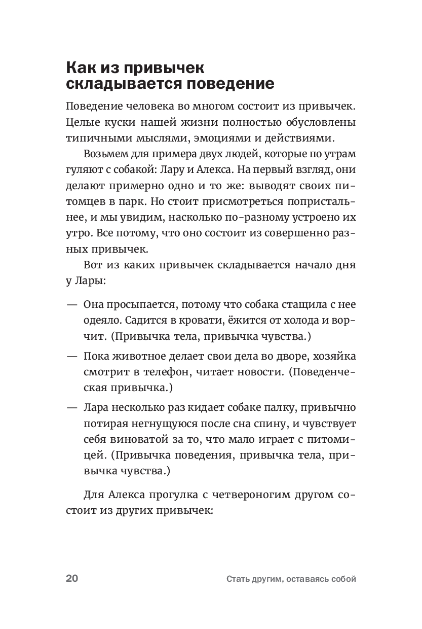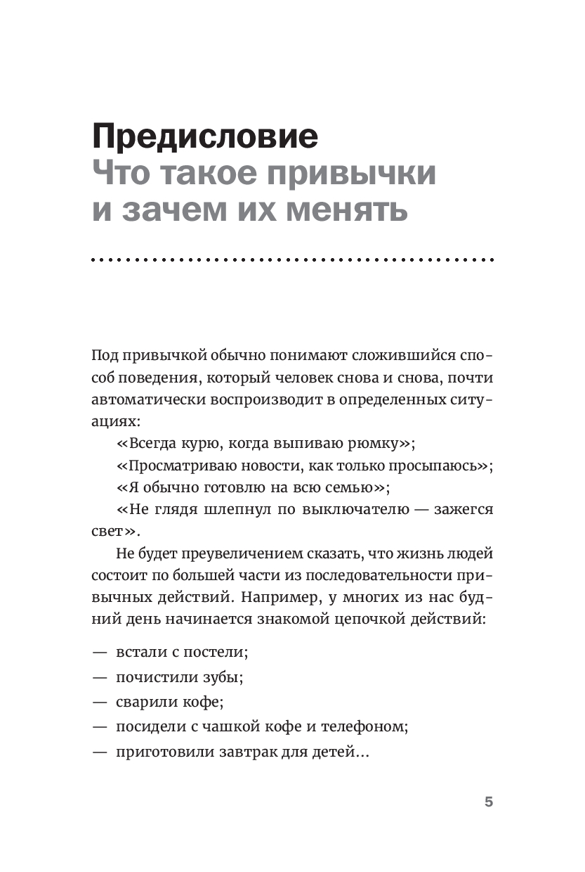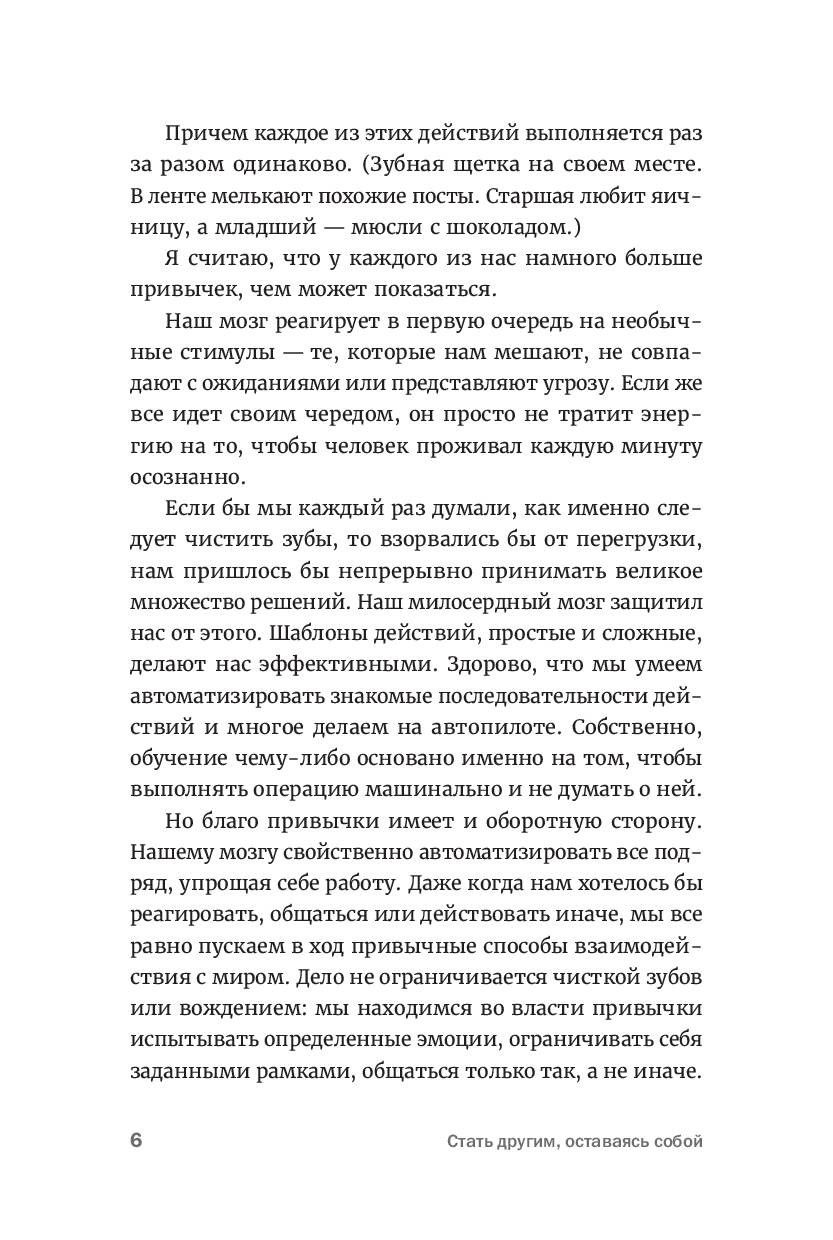 Автор считает, что для эффективного изменения любой привычки необходимо разделить ее на более мелкие "микропривычки" и работать с каждой из них. Кроль предлагает конкретные стратегии: от простых изменений в поведении до сложной работы с эмоциями и мыслительными паттернами. На примерах из реальной практики автор демонстрирует, как применять свой подход, помогая читателю не только изменить конкретные привычки, но и стать более гибким, открытым к новому опыту и способным управлять своей жизнью.