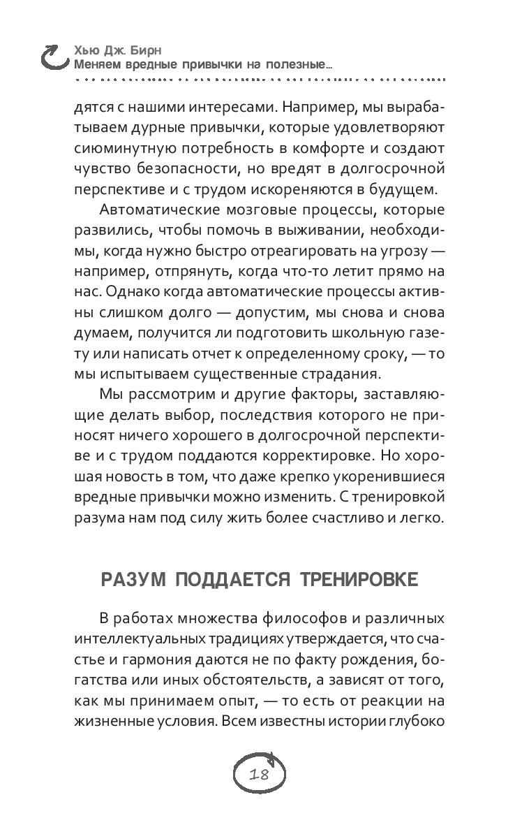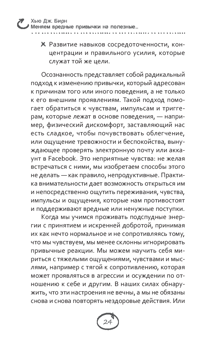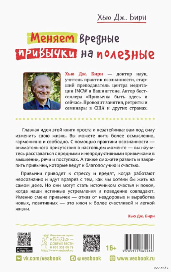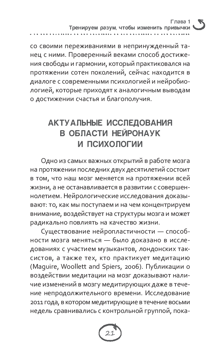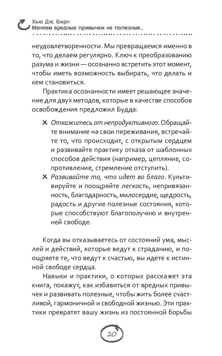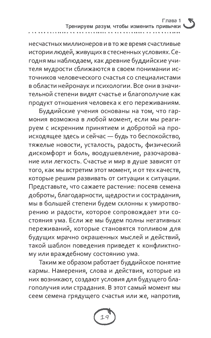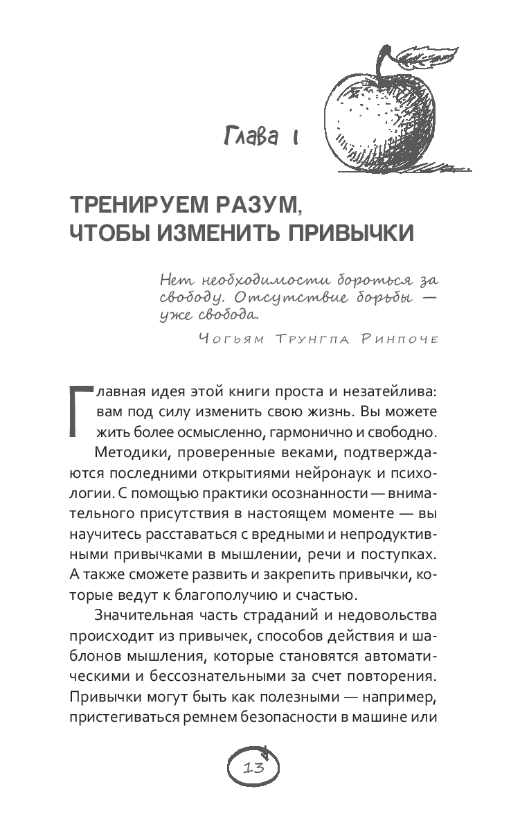 Главная идея этой книги проста и незатейлива: вам под силу изменить свою жизнь. Вы можете жить более осмысленно, гармонично и свободно. С помощью практики осознанности – внимательного присутствия в настоящем моменте – вы научитесь расставаться с вредными и непродуктивными привычками в мышлении, речи и поступках. А также сможете развить и закрепить привычки, которые ведут к благополучию и счастью.