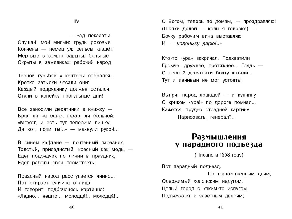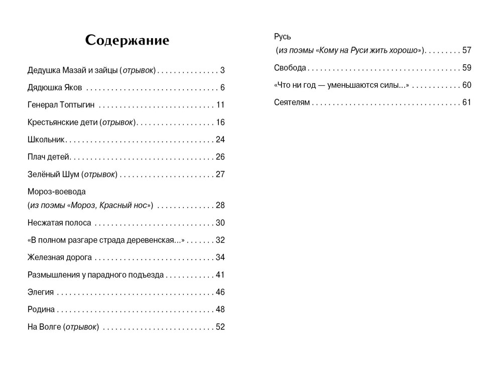 В эту детскую книгу вошли стихотворения великого русского поэта Николая Алексеевича Некрасова, рекомендованные к прочтению в средней школе: "Дедушка Мазай и зайцы", "Дядюшка Яков", "Крестьянские дети", "Школьник", "Железная дорога", "Размышления у парадного подъезда", "Несжатая полоса" и другие.