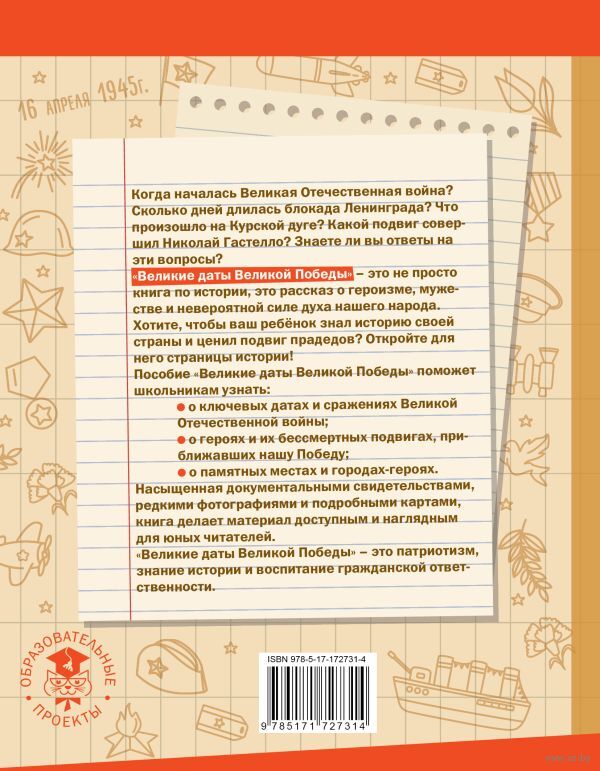"Великие даты Великой Победы" – это не просто книга по истории, это рассказ о героизме, мужестве и невероятной силе духа нашего народа. Хотите, чтобы ваш ребёнок знал историю своей страны и ценил подвиг прадедов? Откройте для него страницы истории!