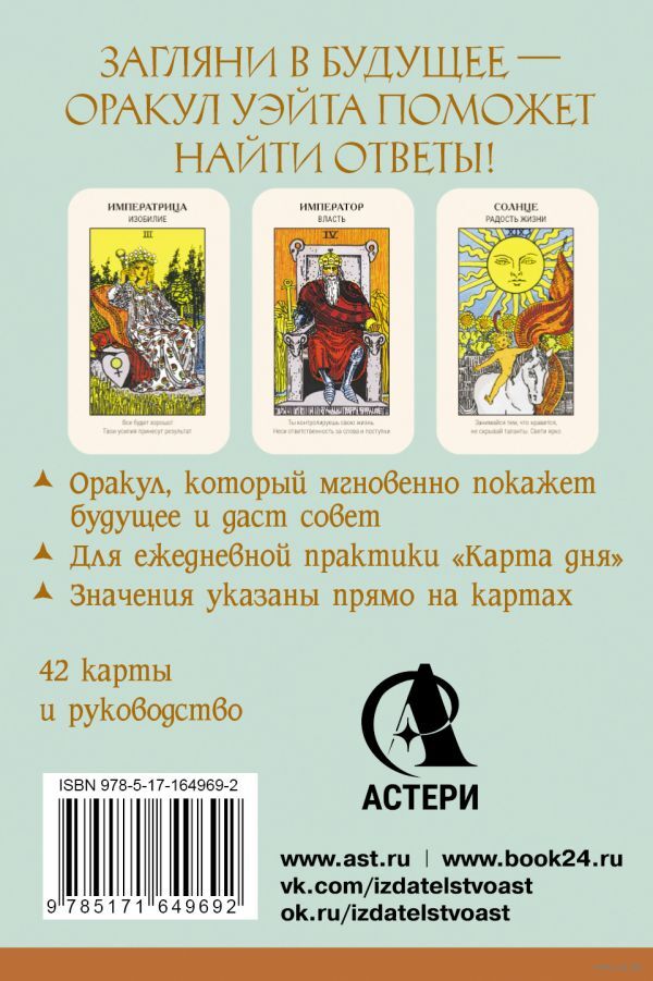 Точный Оракул на основе образов Таро Уэйта. Колода, которая даст немедленный ответ, совет на день и поможет принять решение. В основе – сила 42 главных Арканов Таро. Энергии Старшей колоды и карт Двора быстро ответят на ваш запрос и дадут совет.