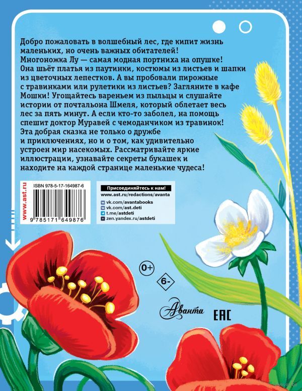 Добро пожаловать в лес, где шьют платья из паутинки и пекут пирожные из травинок. Вы познакомитесь с жителями леса и узнаете секреты обаятельных букашек. Яркая, добрая сказка с историями про насекомых – для маленьких исследователей и больших фантазёров!