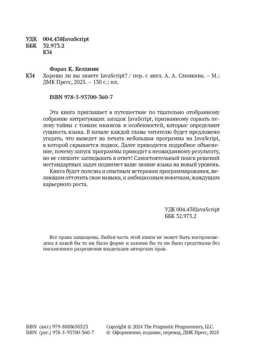 Если вам доводилось испытывать радость при виде элегантного кода или восторг при решении трудной задачи, то эта книга для вас. В ней собраны необычные задачи на JavaScript, призванные раскрыть нюансы и особенности языка. Разработчики должны знать о них, если хотят писать надежный и предсказуемый код. Каждая задача – не просто упражнение в программировании, а источник знаний и испытание ваших способностей.