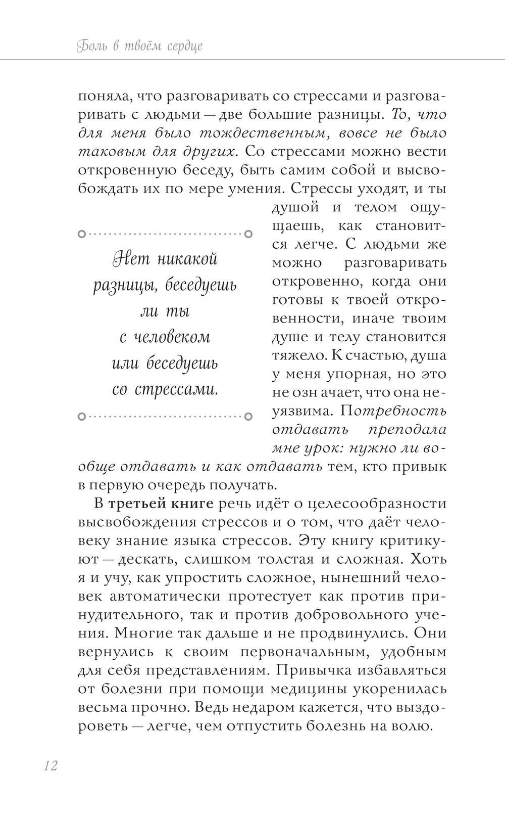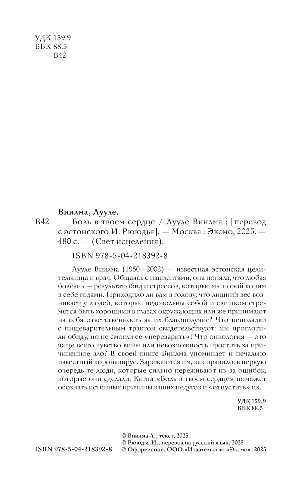 Лууле Виилма (1950—2002) – известная эстонская целительница и парапсихолог. Общаясь с пациентами, она поняла, что любая болезнь – результат обид и стрессов, которые мы порой копим в себе годами. Приходило ли вам в голову, что лишний вес возникает у людей, которые недовольны собой и слишком стремятся быть хорошими в глазах окружающих или же принимают на себя ответственность за их благополучие? Что неполадки с пищеварительным трактом свидетельствуют: мы проглотили обиду, но не смогли ее "переварить"? Что онкология – это чаще всего чувство вины или невозможность простить за причиненное зло? В своей книге Виилма упоминает и печально известный коронавирус. Заражаются им, как правило, в первую очередь те люди, которые сильно переживают из-за ошибок, которые они сделали. Книга "Боль в твоем сердце" поможет осознать истинные причины ваших недугов и "отпустить" их.