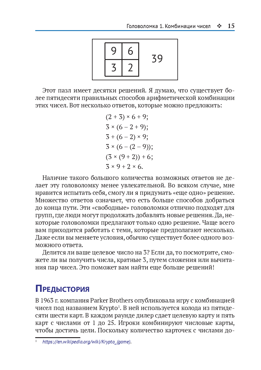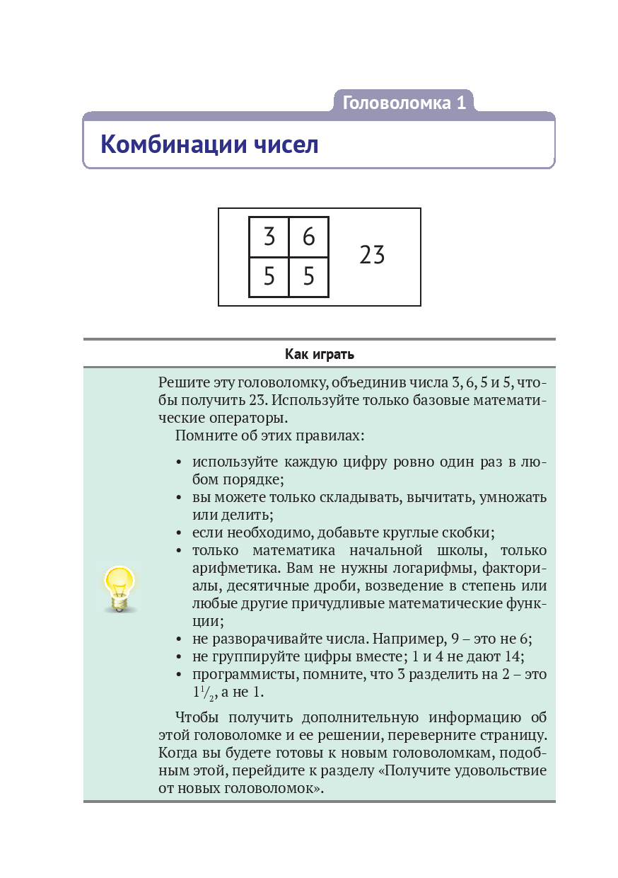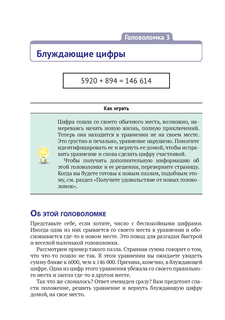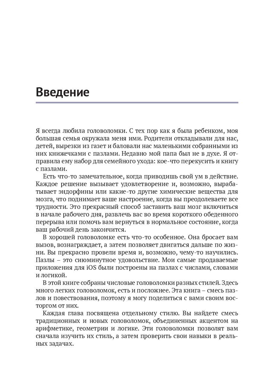 Каждая головоломка сопровождается пояснениями и интересными фактами. Основная цель этой книги – позабавить читателя и доставить ему интеллектуальное удовольствие. Но даже за простыми математическими развлечениями скрывается тренировка остроты ума и широты кругозора.