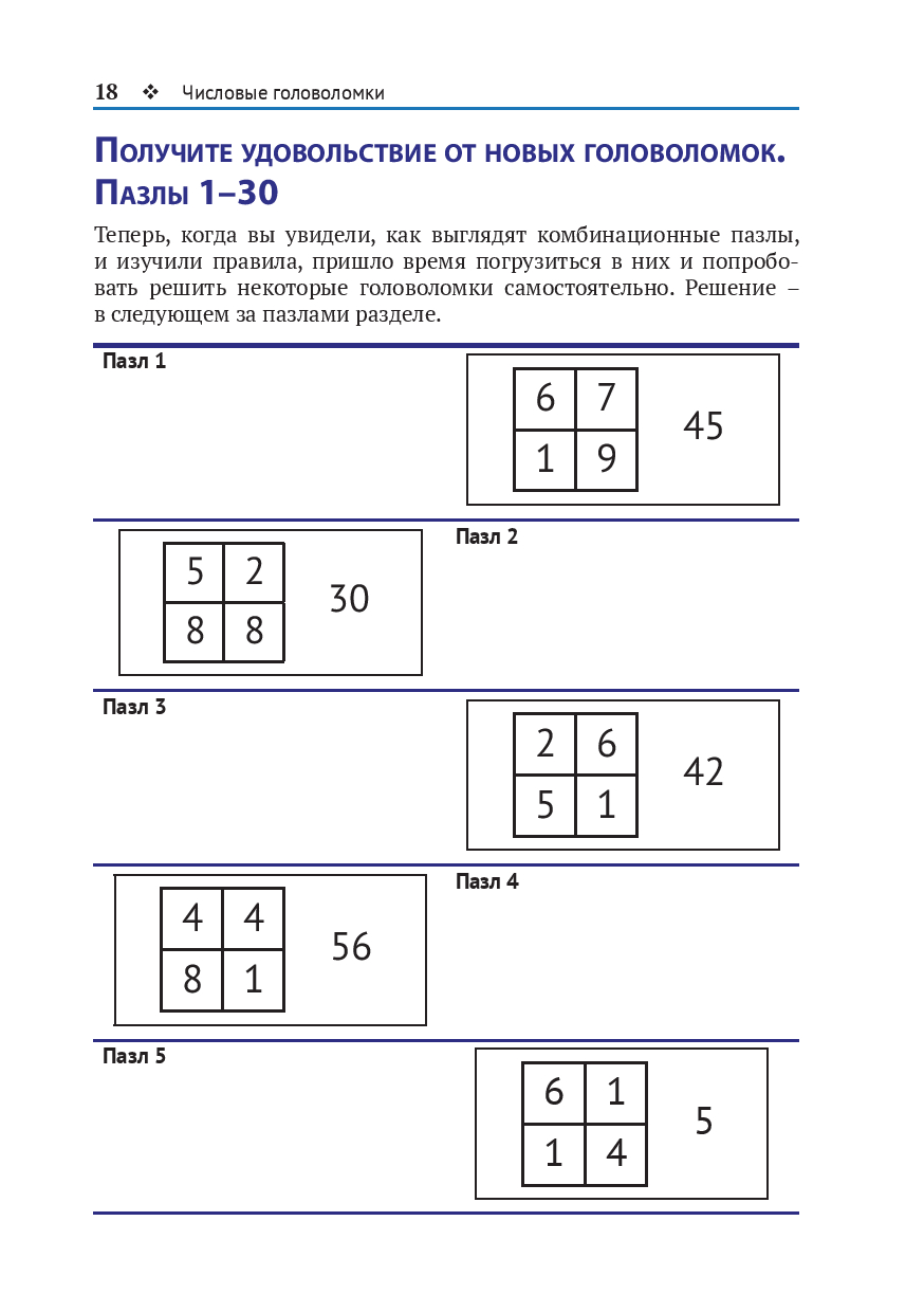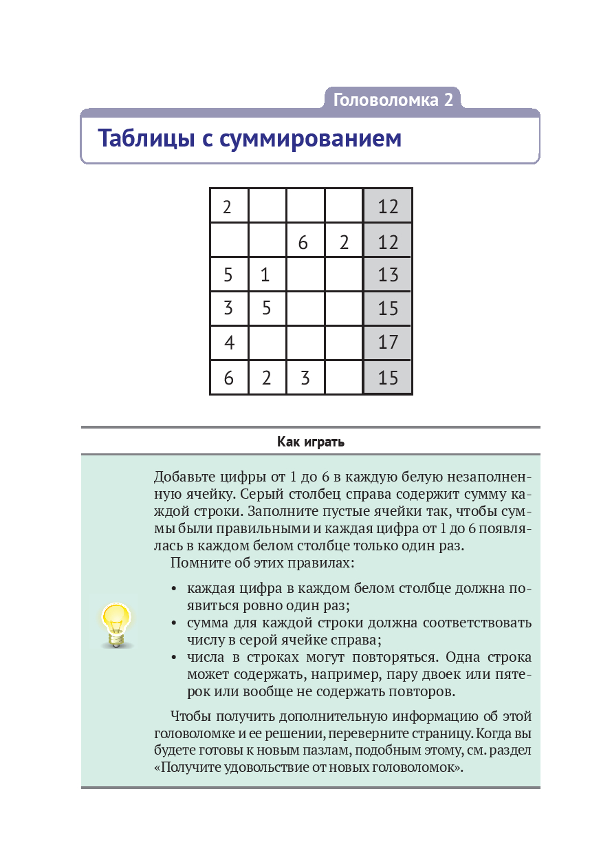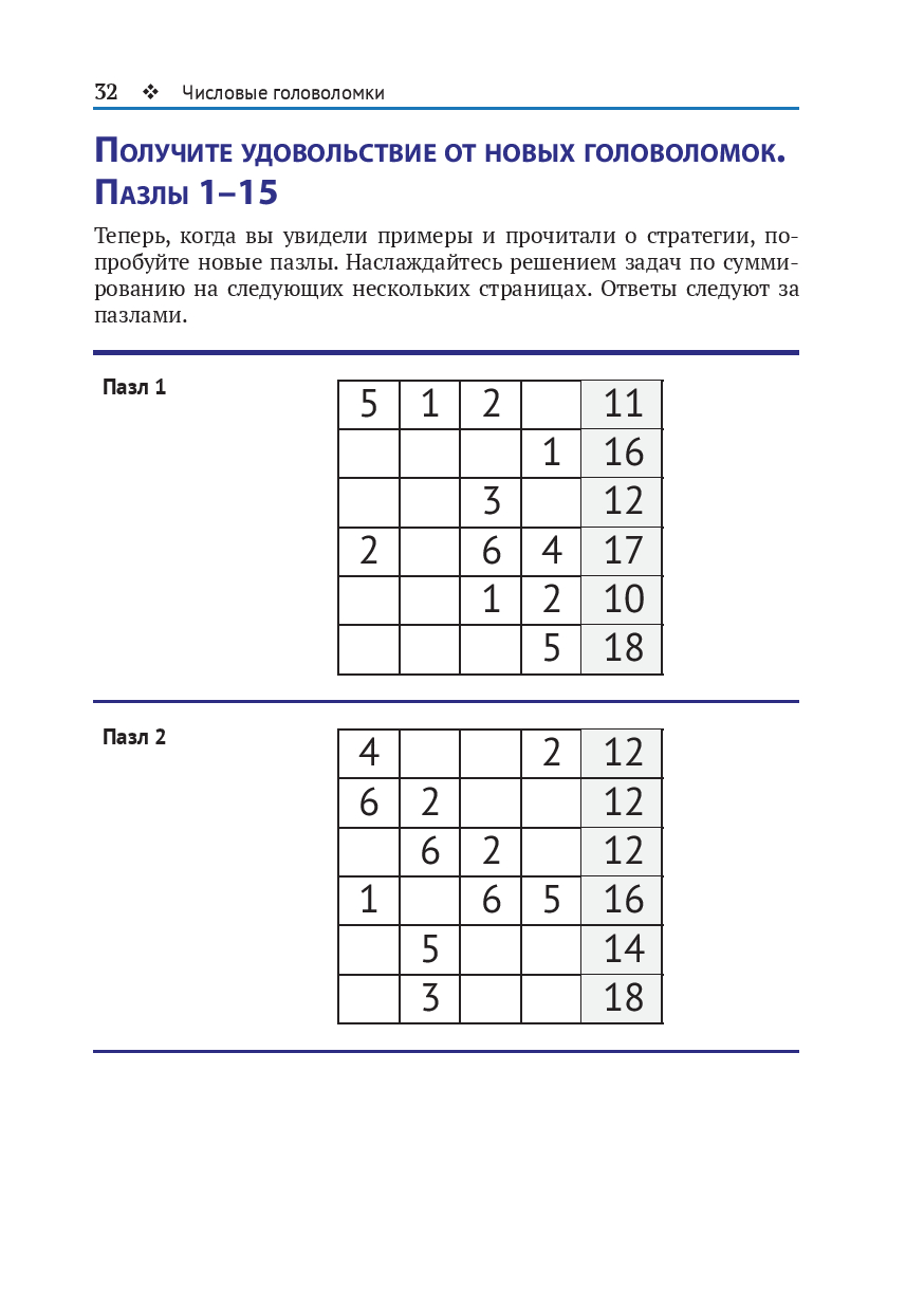 Вы можете выполнять задания в качестве разминки перед началом рабочего дня, во время перерыва на кофе или вечернего отдыха. Все, что вам нужно, это логическое мышление, немного терпения и ясный ум. Скорее берите карандаш и приступайте к решению!