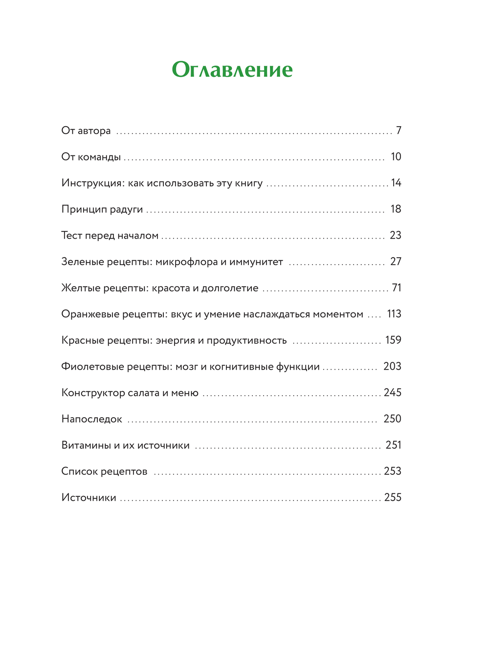 В книге пять "цветных" разделов: зеленый, желтый, оранжевый, красный и фиолетовый – по принципу радуги. Каждый цвет связан с важными темами здорового питания: иммунитет и энергия, работа сердца и мозга, красота и долголетие.
