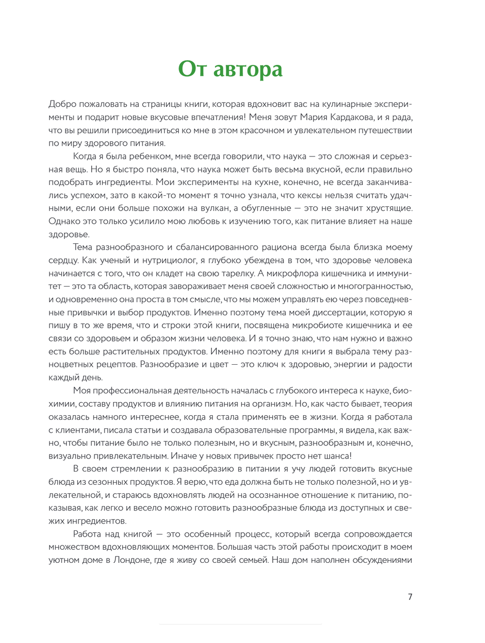 Мария Кардакова дает научные комментарии, приводит исследования и много полезных советов, которые помогут чувствовать себя лучше каждый день. Автор опирается на доказательную науку, которая, как и блюда, подается легко и занимательно. А еще – показывает, как заботиться о себе и близких без стресса, сложного планирования и сверхусилий.
