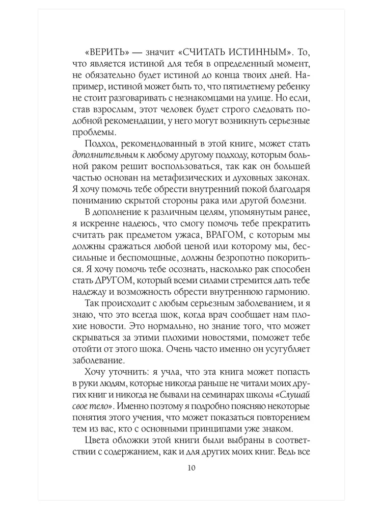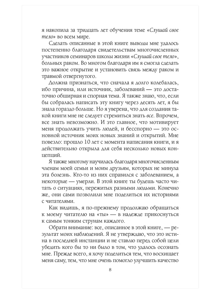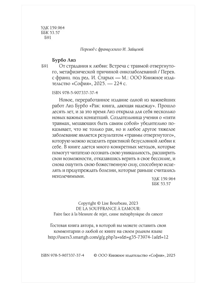Новое, переработанное издание одной из важнейших работ Лиз Бурбо "Рак: книга, дающая надежду". Прошло десять лет, и за это время Лиз открыла для себя несколько новых важных концепций. Создательница учения о "пяти травмах, мешающих быть самим собой" убедительно показывает, что не только рак, но и любое другое тяжелое заболевание является результатом "травмы отвергнутого", которую можно исцелить практикой безусловной любви к себе.
