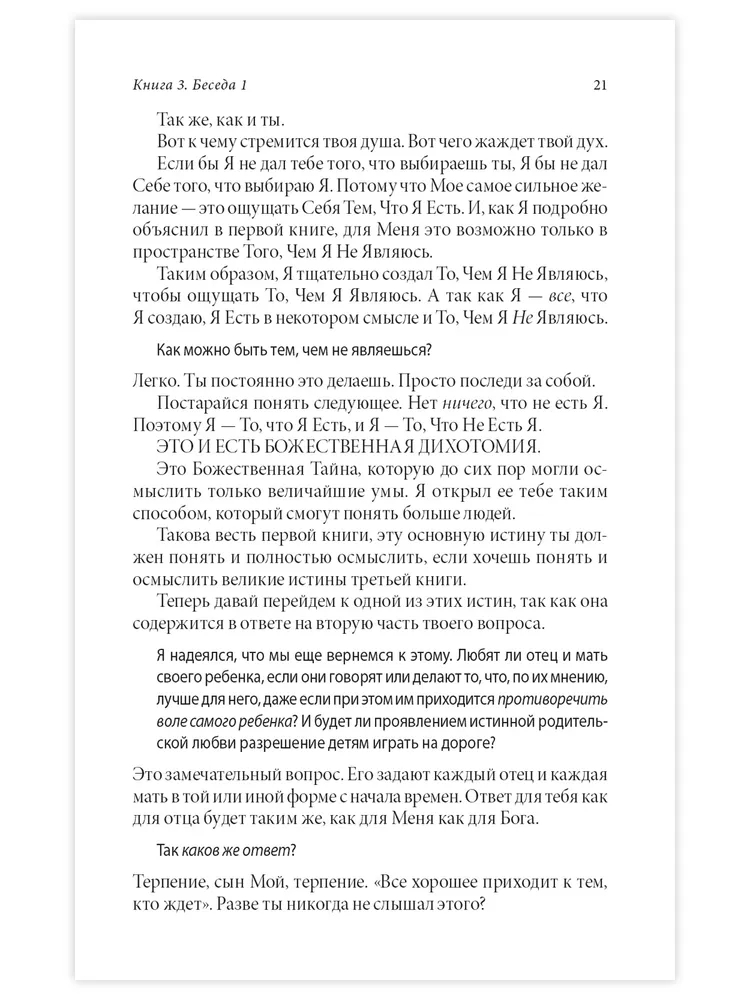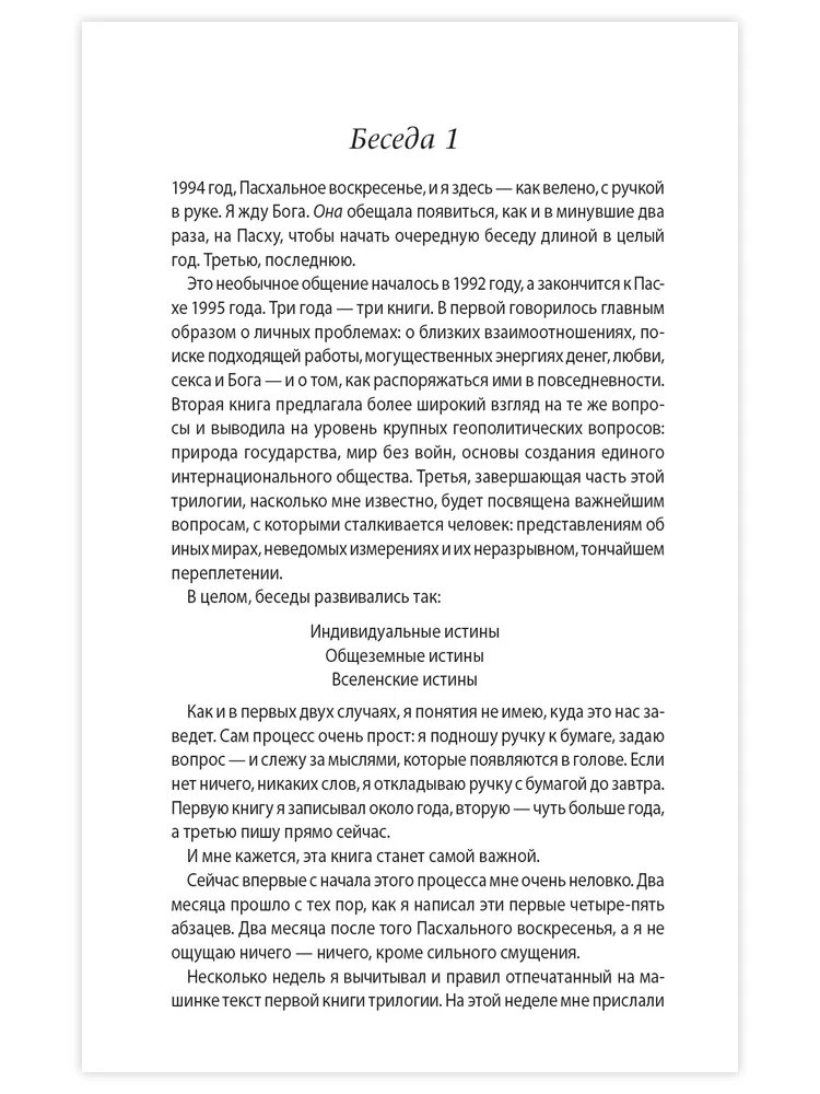 В третьей книге серии "Беседы с Богом" Нил Доналд Уолш продолжает свой диалог с Богом, углубляясь в глобальные и космические вопросы. В книге обсуждаются темы, касающиеся судьбы человечества, эволюции человеческой цивилизации и более широких концепций жизни в других мирах. Уолш исследует природу Бога и Вселенной, задавая вопросы о мироздании, времени, пространстве и человеческой ответственности перед планетой. Эта книга поднимает философские и духовные вопросы, побуждая читателя задуматься о своём месте в мире и взаимоотношениях с Богом.