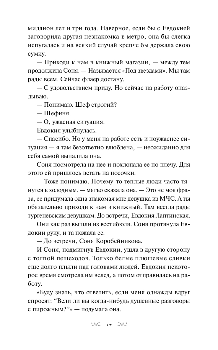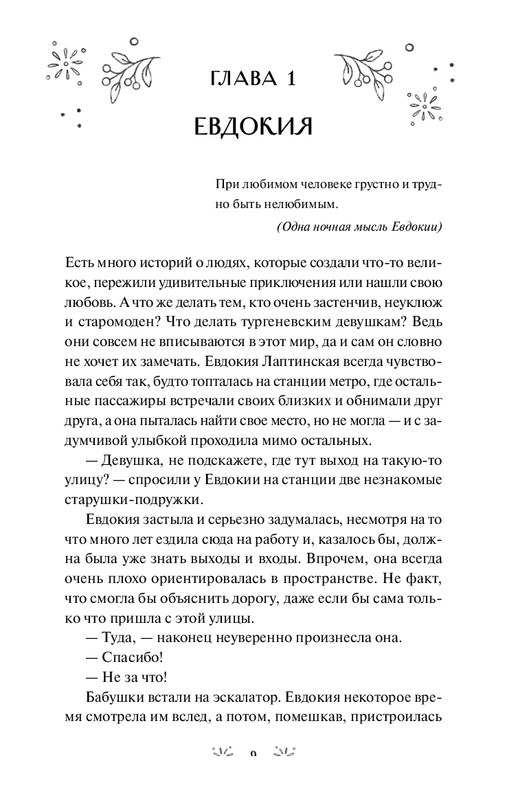 Евдокия Лаптинская привыкла, что ей всегда не везет. Мало того, что она робкая до невозможности, так еще и безответно влюблена. Но все меняется, когда в ее жизни возникает книжный магазин "Под звездами", где принято ходить в пижаме и можно встретить героев из самых разных книг. Евдокия заводит друзей, среди которых настоящие тургеневские девушки, встречает современного мистера Дарси, а также оказывается втянута в детективную историю: ее любимая писательница выходит на дорогу посреди ночи и бесследно исчезает…