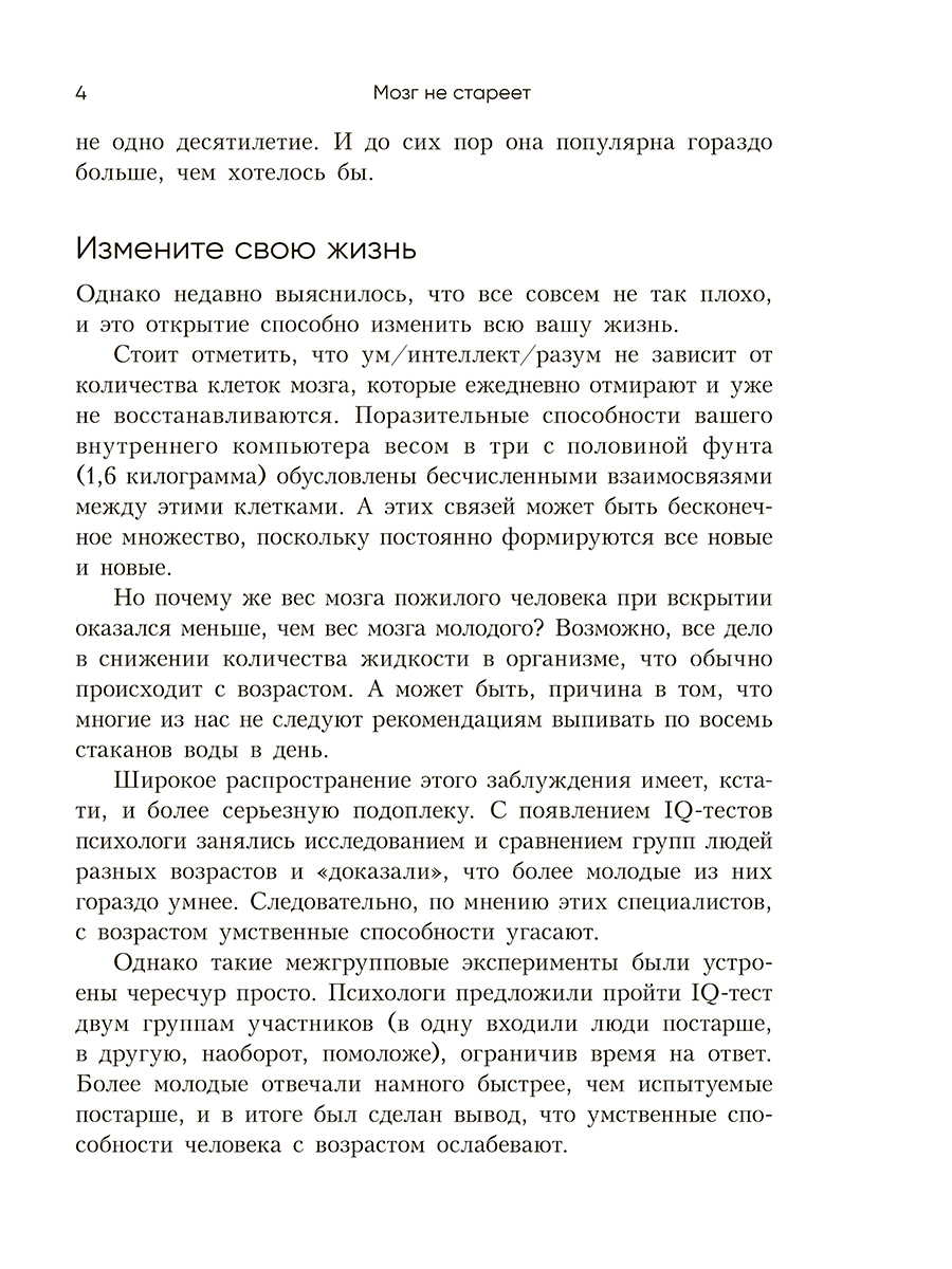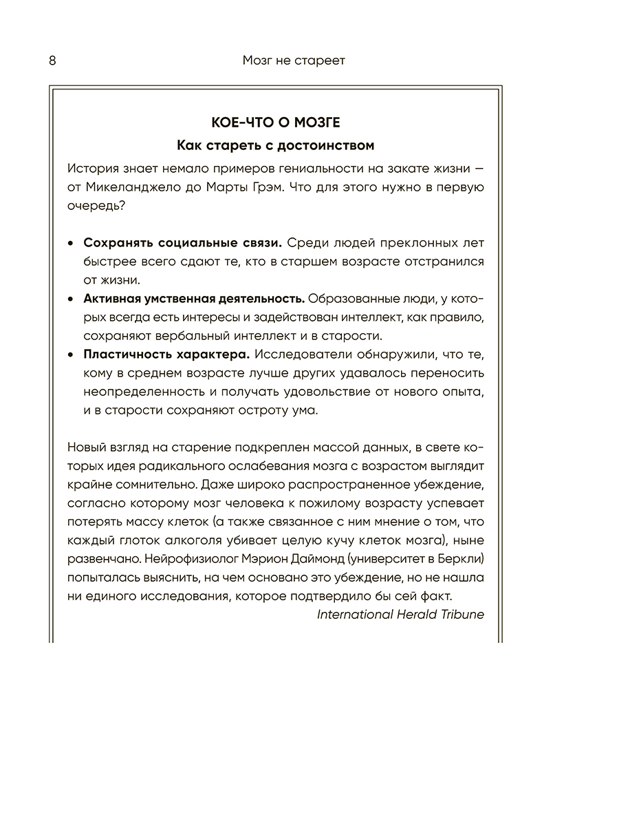 Книга полностью перевернет ваши представления о мозге и старении. Да, организм стареет, но мозг при этом вовсе не деградирует – наоборот, с годами он становится лишь совершеннее.