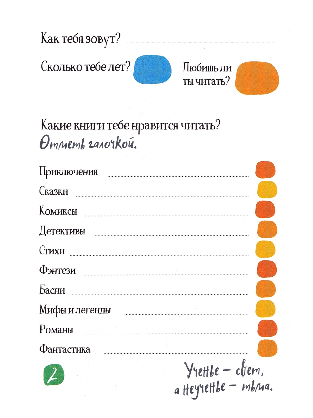 Этот читательский дневник хочется заполнять снова и снова. Он поможет ребёнку ещё больше подружиться с книгами. На его страничках ребёнок будет рассказывать о прочитанных книгах, вспоминать главных героев, делиться своими впечатлениями. Обычные странички чередуются с весёлыми заданиями: анкетой читателя, филвордами и книжным гаданием.