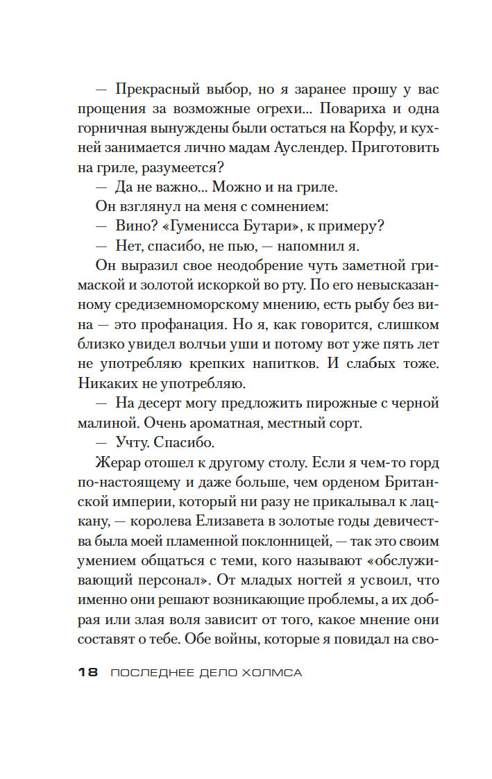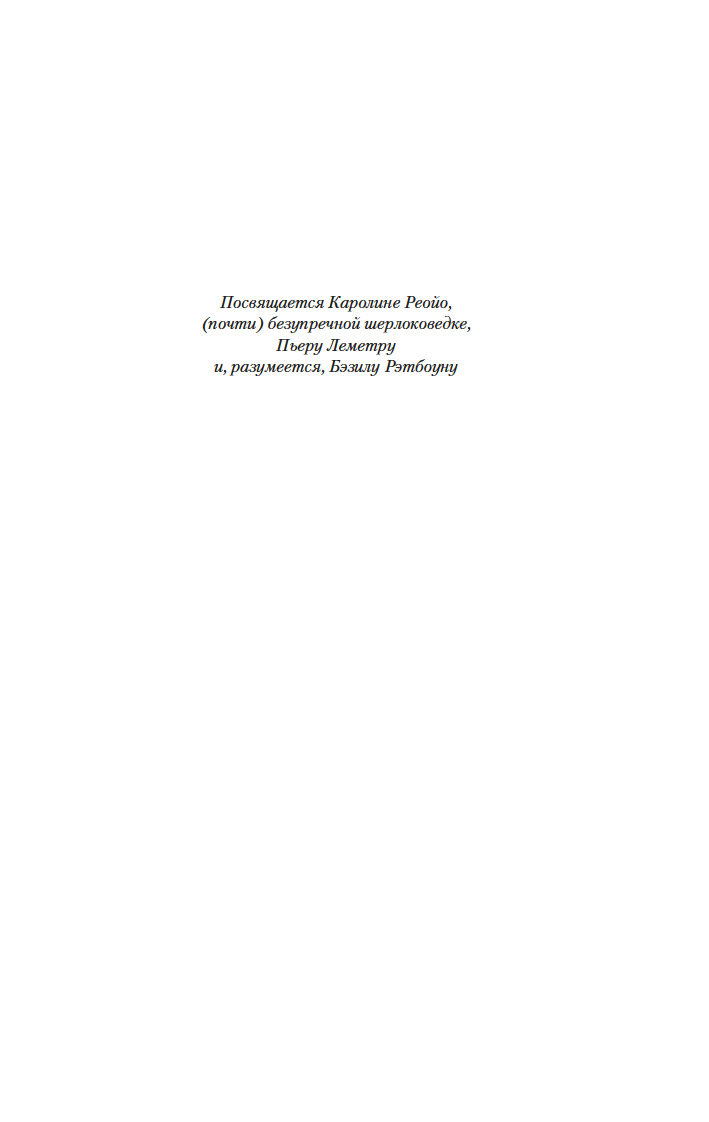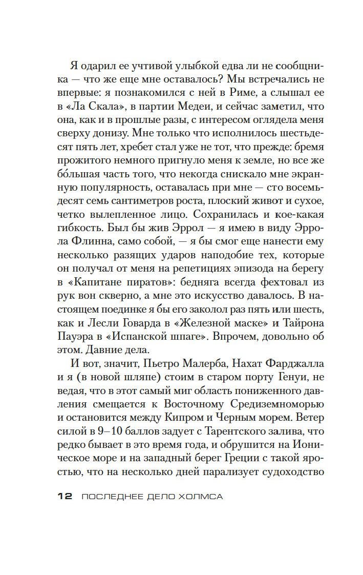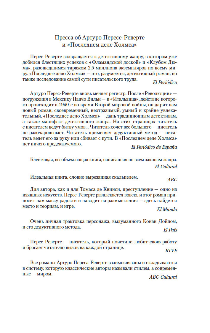 Артуро Перес-Реверте – бывший военный журналист, прославленный автор блестящих исторических, военных, приключенческих и детективных романов, переведенных на сорок языков, создатель цикла о капитане Диего Алатристе, обладатель престижнейших литературных наград. "Последнее дело Холмса" – его поклон (будем надеяться, не последний) жанру классического детектива, где расследование требует холодного ума, фантазии и таланта к дедукции, а не эффектной стрельбы из револьвера, драк в темных переулках, мигающих неоновых вывесок за окном и непременного бурбона в ящике стола. Здесь происходит битва умов. Здесь будут Холмс, Ватсон, профессор Мориарти – не исключено, что и Ирэн Адлер. И любовь к книгам здесь тоже, конечно, будет, потому что чтение остается одним из немногих – быть может, самым главным – нашим оружием против зла, смерти и хаоса.