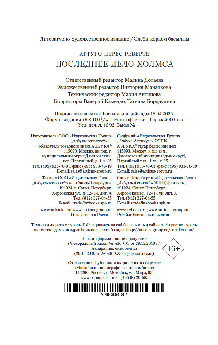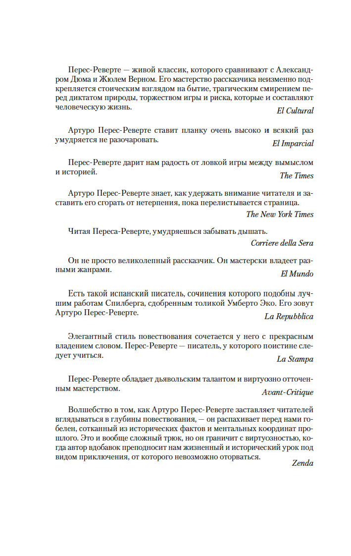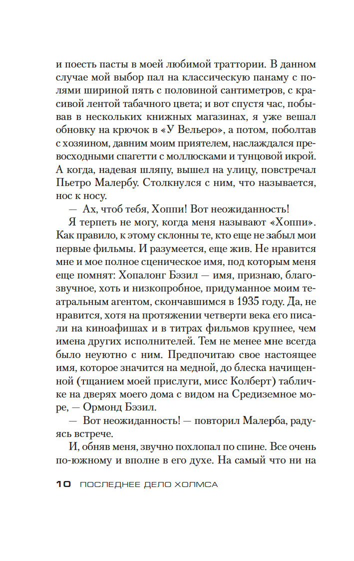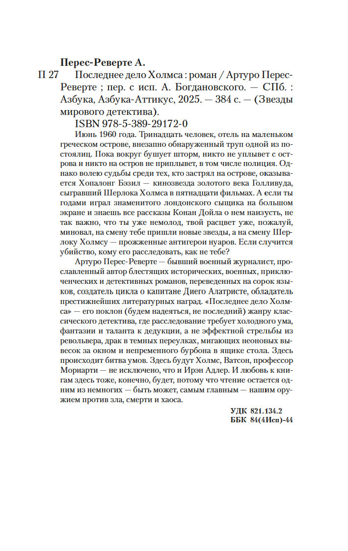 Артуро Перес-Реверте – бывший военный журналист, прославленный автор блестящих исторических, военных, приключенческих и детективных романов, переведенных на сорок языков, создатель цикла о капитане Диего Алатристе, обладатель престижнейших литературных наград. "Последнее дело Холмса" – его поклон (будем надеяться, не последний) жанру классического детектива, где расследование требует холодного ума, фантазии и таланта к дедукции, а не эффектной стрельбы из револьвера, драк в темных переулках, мигающих неоновых вывесок за окном и непременного бурбона в ящике стола. Здесь происходит битва умов. Здесь будут Холмс, Ватсон, профессор Мориарти – не исключено, что и Ирэн Адлер. И любовь к книгам здесь тоже, конечно, будет, потому что чтение остается одним из немногих – быть может, самым главным – нашим оружием против зла, смерти и хаоса.