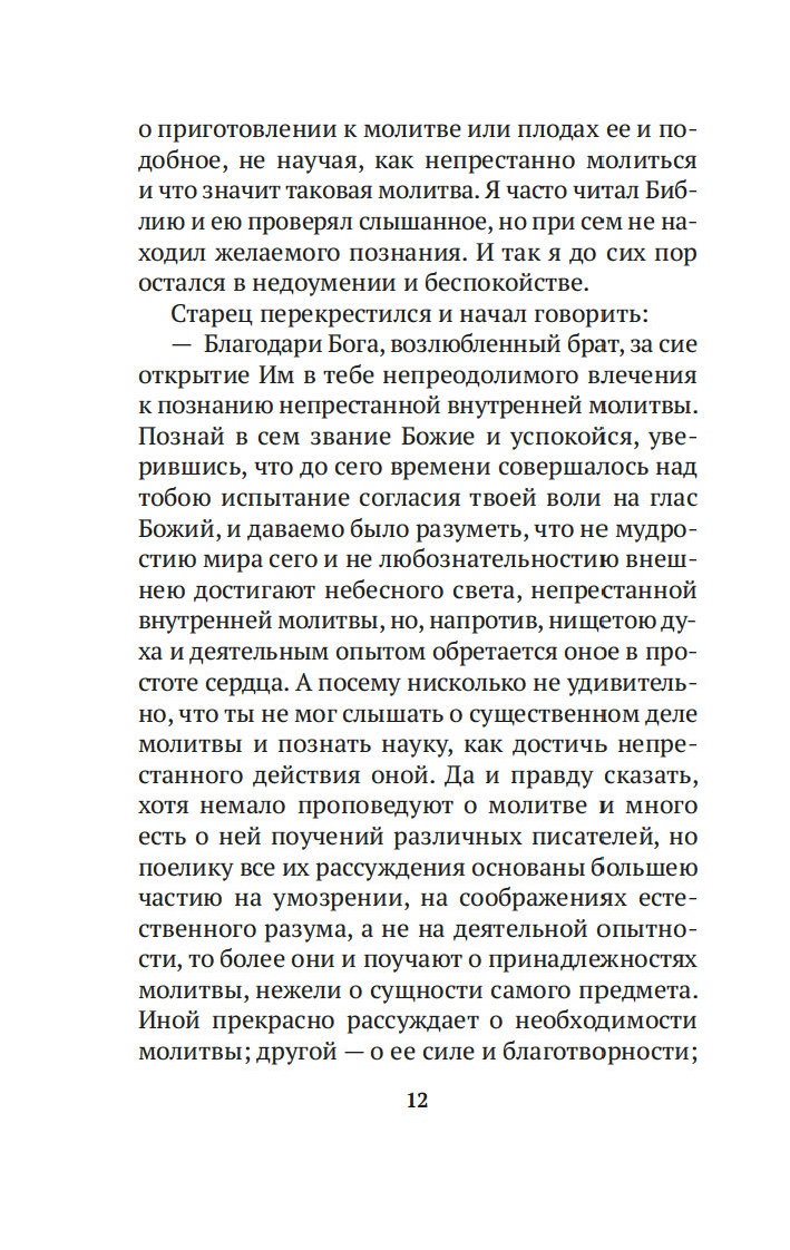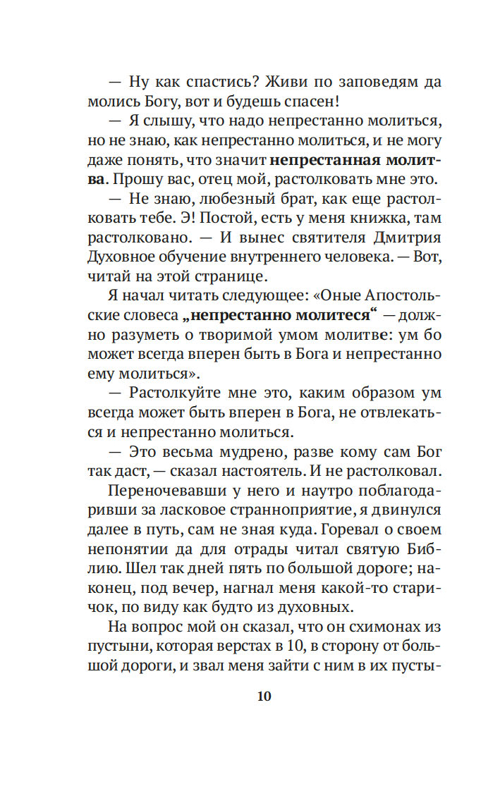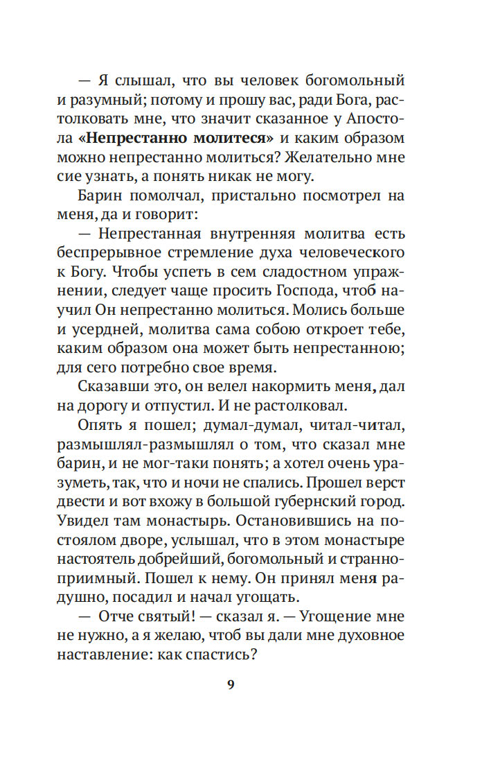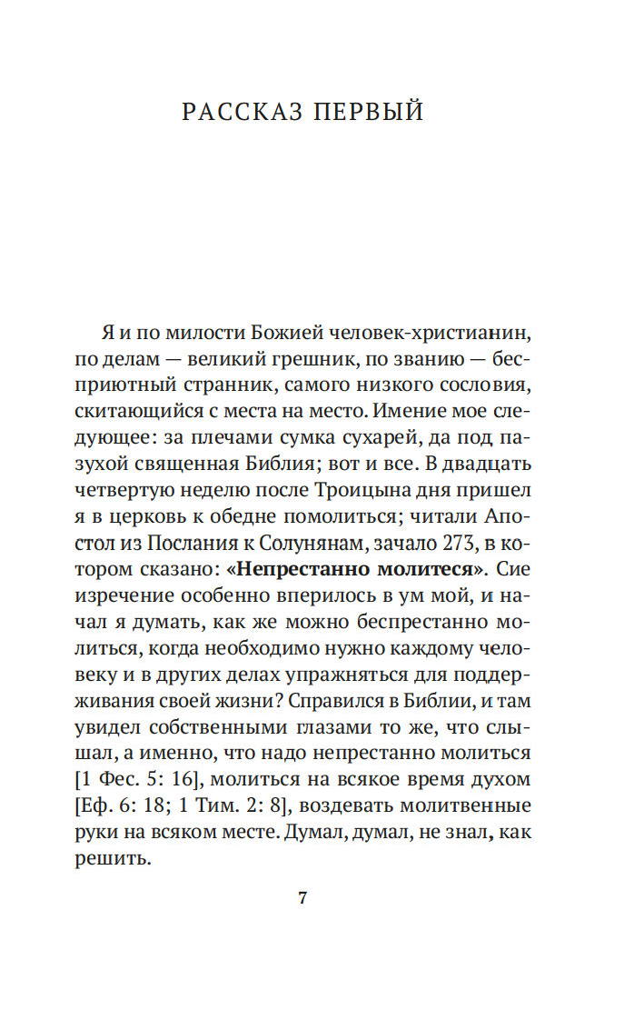 Истинная молитва есть беспрерывное стремление духа человеческого к Богу. Именно об этом повествуют "Откровенные рассказы странника духовному своему отцу", написанные неизвестным автором во второй половине XIX столетия. Герой этих рассказов – бесприютный странник, услышав однажды в церкви слова апостола Павла "Непрестанно молитесь", отправляется на поиски тех, кто сумеет растолковать ему смысл этого изречения. Странствуя по дорогам Святой Руси, встречает он на своем пути разных людей, с сердечной теплотой перечитывает Библию и наставления Святых Отцов, в беседе и уединении постигает науку непрестанной Иисусовой молитвы.