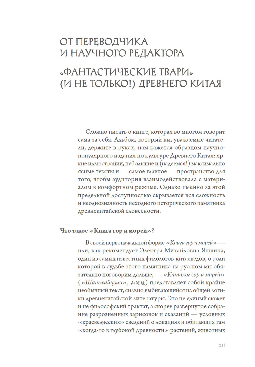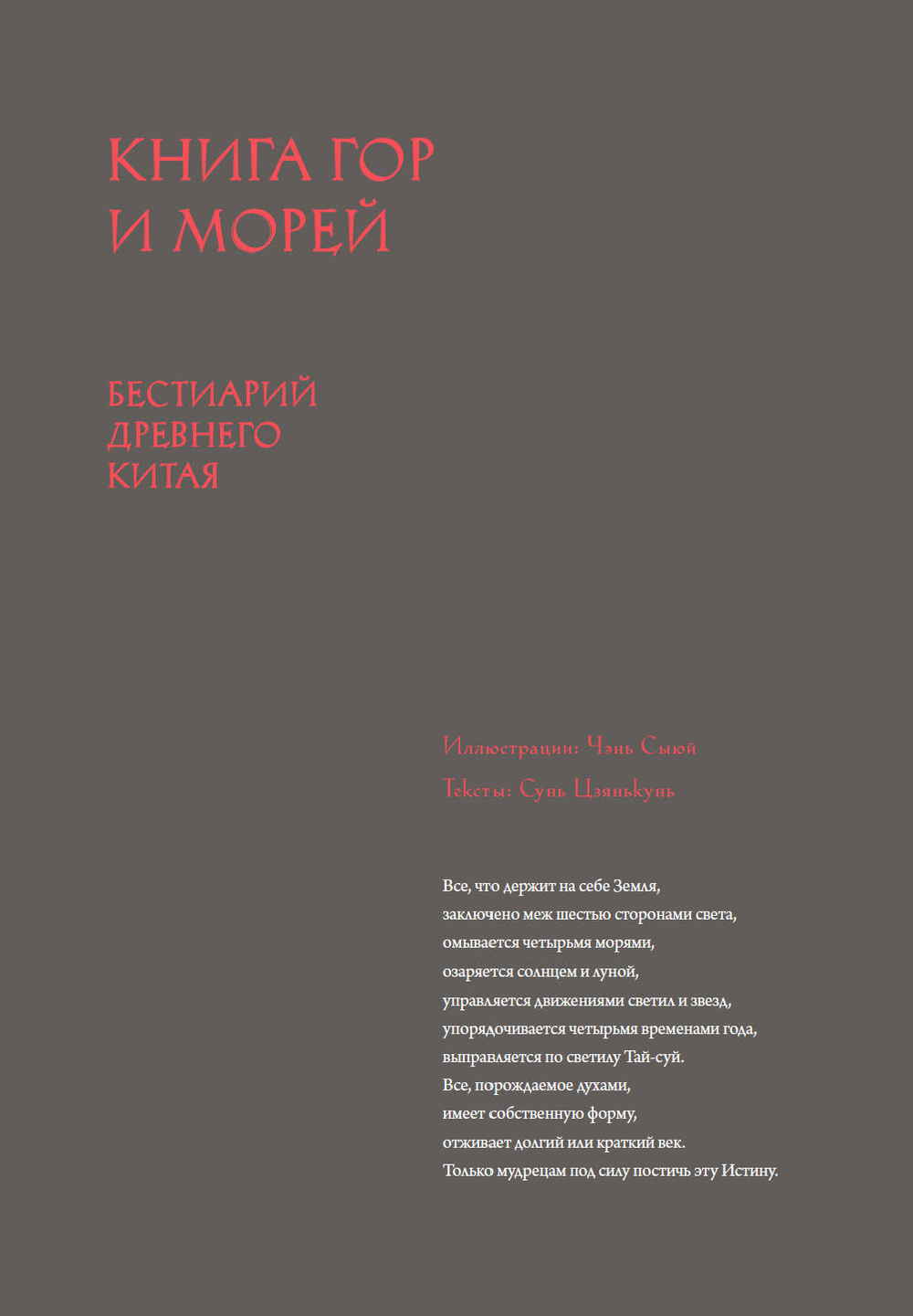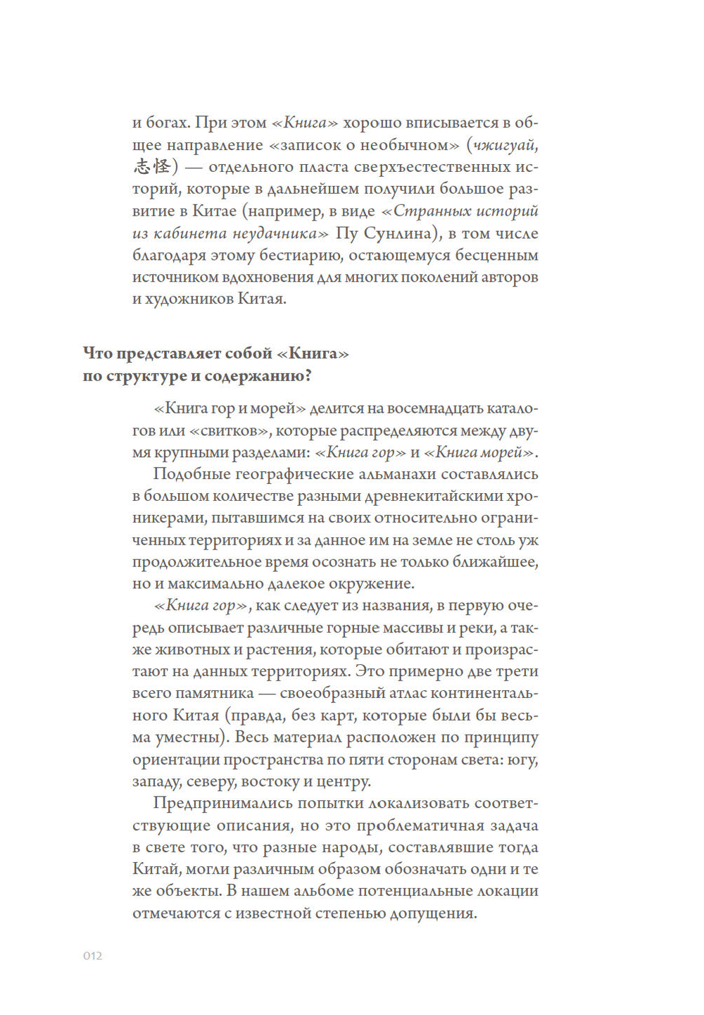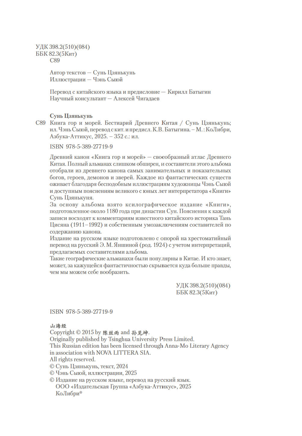 "Книга гор и морей" – своеобразный атлас континентального Китая. Полный альманах очень обширен, но для этого издания составители отобрали из древнего канона самых занимательных и показательных богов, героев, демонов и зверей. Каждое из фантастических существ оживает благодаря бесподобным иллюстрациям художницы Чэнь Сыюй и доступным пояснениям великого с юных лет интерпретатора "Книги" Сунь Цзянькуня.