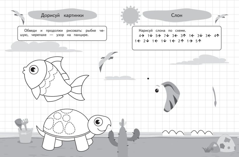 На страницах тетради очень крупные клеточки, которые сделают задачу доступной для малыша, который только приступает к решению графических задач на листе бумаги. Упражнения разработаны по принципу постепенного усложнения. Для работы в тетради лучше всего подойдёт простой карандаш. Он позволит ребёнку выработать правильную постановку руки и силу нажима.