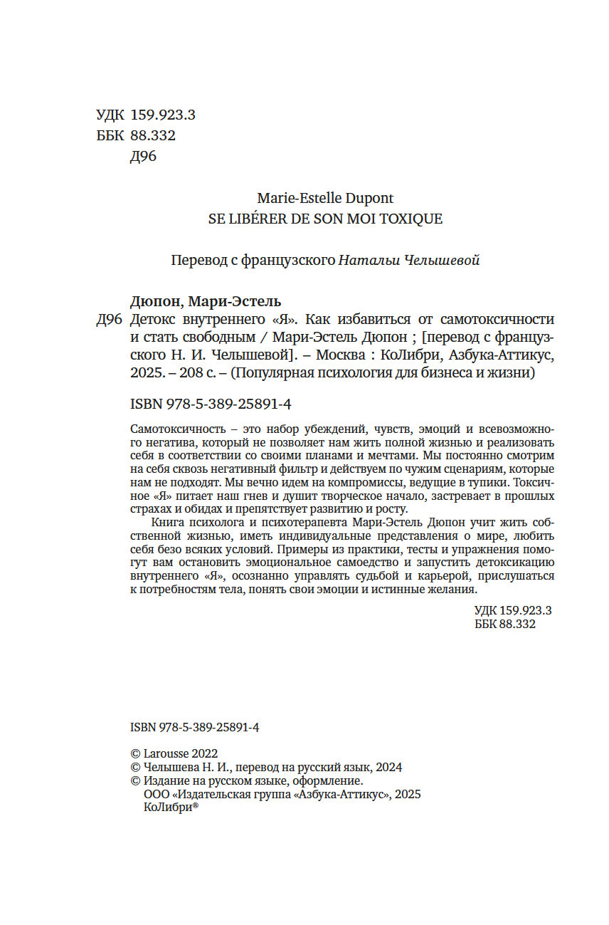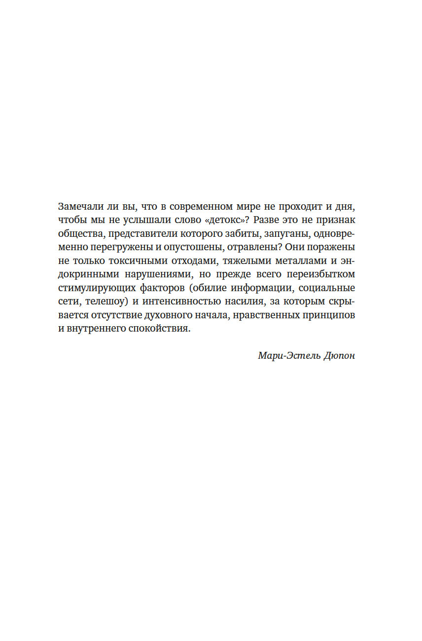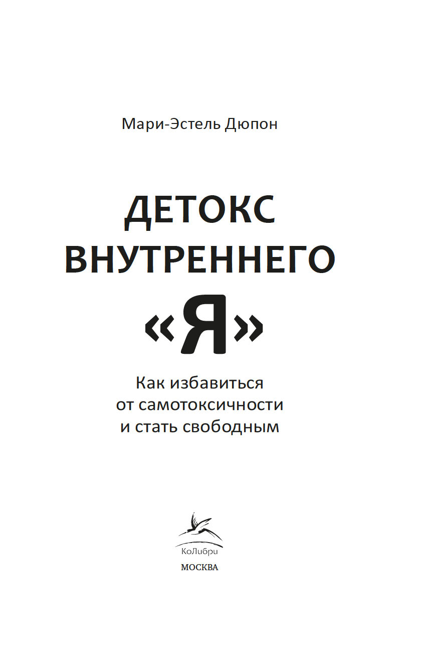 Книга психолога и психотерапевта Мари-Эстель Дюпон учит жить собственной жизнью, иметь индивидуальные представления о мире, любить себя без всяких условий. Примеры из практики, тесты и упражнения помогут вам остановить эмоциональное самоедство и запустить детоксикацию внутреннего "Я", осознанно управлять судьбой и карьерой, прислушаться к потребностям тела, понять свои эмоции и истинные желания.