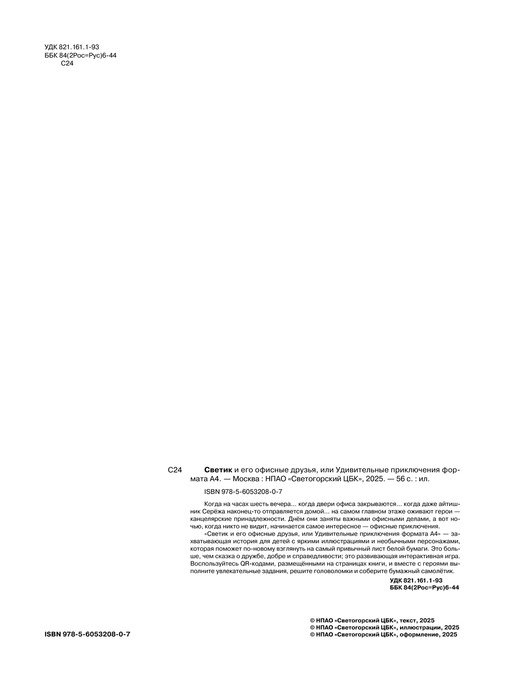 "Светик и его офисные друзья, или Удивительные приключения формата А4" – захватывающая история для детей с яркими иллюстрациями и необычными персонажами, которая поможет по-новому взглянуть на самый привычный лист белой бумаги. Это больше, чем сказка о дружбе, добре и справедливости; это развивающая интерактивная игра. Воспользуйтесь QR-кодами, размещёнными на страницах книги, и вместе с героями выполните увлекательные задания, решите головоломки и соберите бумажный самолётик.