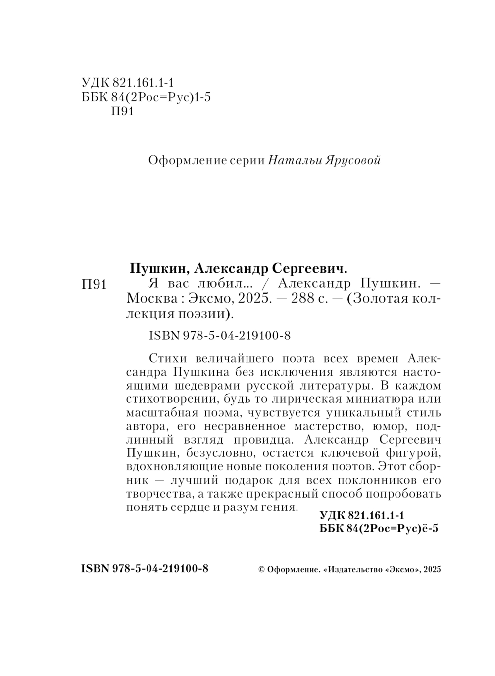 Стихи величайшего поэта всех времён Александра Пушкина без исключения являются настоящими шедеврами русской литературы. В каждом стихотворении, будь то лирическая миниатюра или масштабная поэма, чувствуется уникальный стиль автора, его несравненное мастерство, юмор, подлинный взгляд провидца. Александр Сергеевич Пушкин, безусловно, остается ключевой фигурой, вдохновляющий новые поколения поэтов. Этот сборник – лучший подарок для всех поклонников его творчества, а также прекрасный способ попробовать понять сердце и разум гения.
