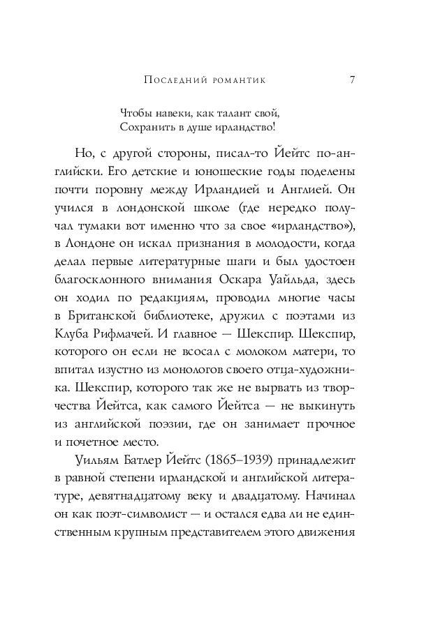 Уильям Батлер Йейтс (1865–1939) – один из величайших поэтов Ирландии, чьё творчество оказало сильнейшее влияние на мировой литературный процесс XX века. По сей день Йейтс поражает читателя своей проникновенной лирикой, сплетённой воедино с ирландской культурной традицией и кельтской мифологией. В настоящее издание включены не только главные стихи поэта, но и его менее известные тексты. Все стихотворения даны в переводе Григория Кружкова. Сборник открывается вступительной статьёй, объясняющей особенности поэтики Йейтса и его места на карте мировой литературы.