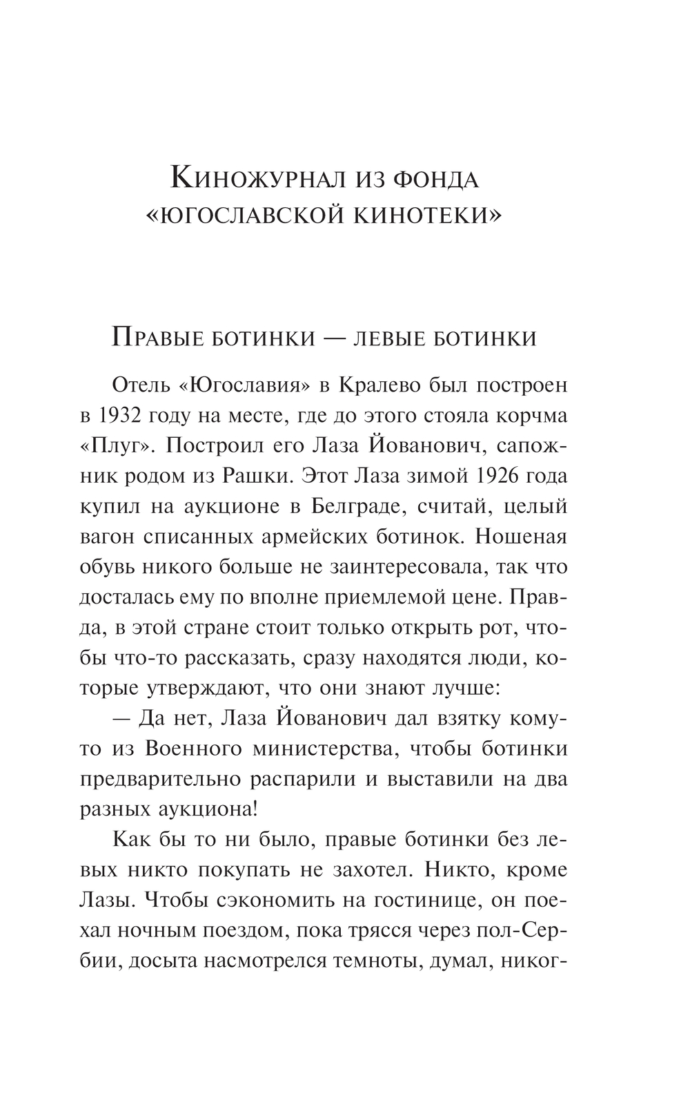 У сапожника Лозы Йовановича была мечта. Ради нее он купил на аукционе целый вагон списанных армейских ботинок на правую ногу. А через месяц на другом аукционе – на левую. Так началась история отеля "Югославия". Под потолком зала для концертов и танцев с гипсовой картиной Вселенной будут проноситься истории людей. Руди Прохаска арендует зал и начнет показывать там фильмы. Его попугай по кличке Демократия не произнесет ни слова. Правительство новой страны национализирует кинотеатр, а попугай перейдет по наследству старому билетеру. Демократия не произнесет ни слова. Лишь после одного знаменательного сеанса, на котором соберутся тридцать человек, Демократия наконец заговорит.