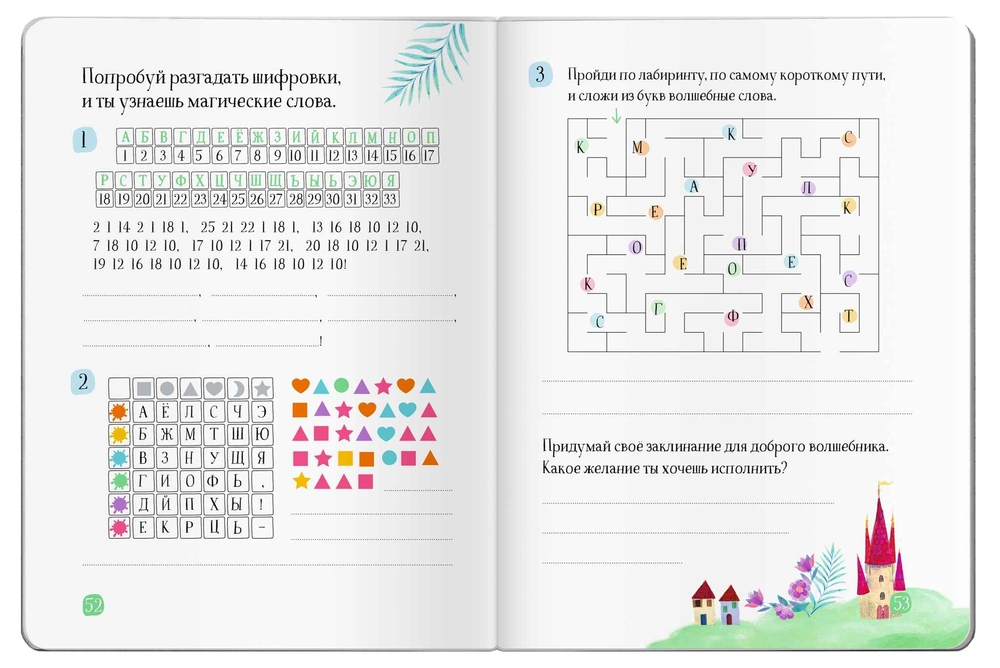 Обычные странички чередуются с занимательными заданиями: ребусами, кроссвордами, буквенными лабиринтами, играми со словами. А в конце можно будет придумать и записать свою историю, а потом попробовать силы в волшебстве.