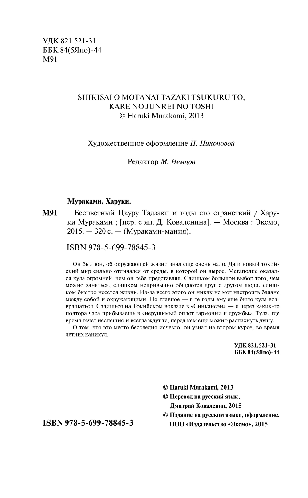 | Название в оригинале | Colorless Tsukuru Tazaki And His Years Of Piligrimage |