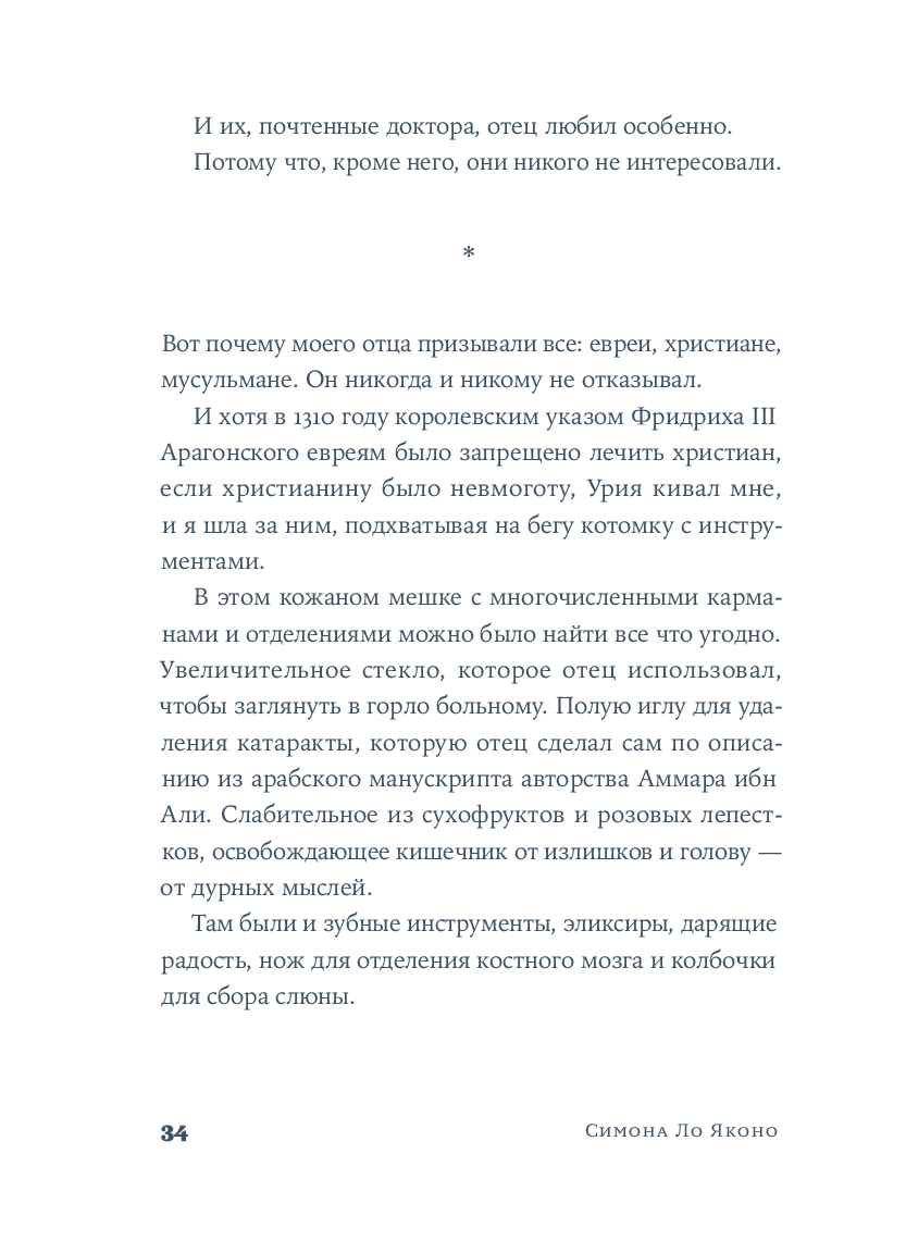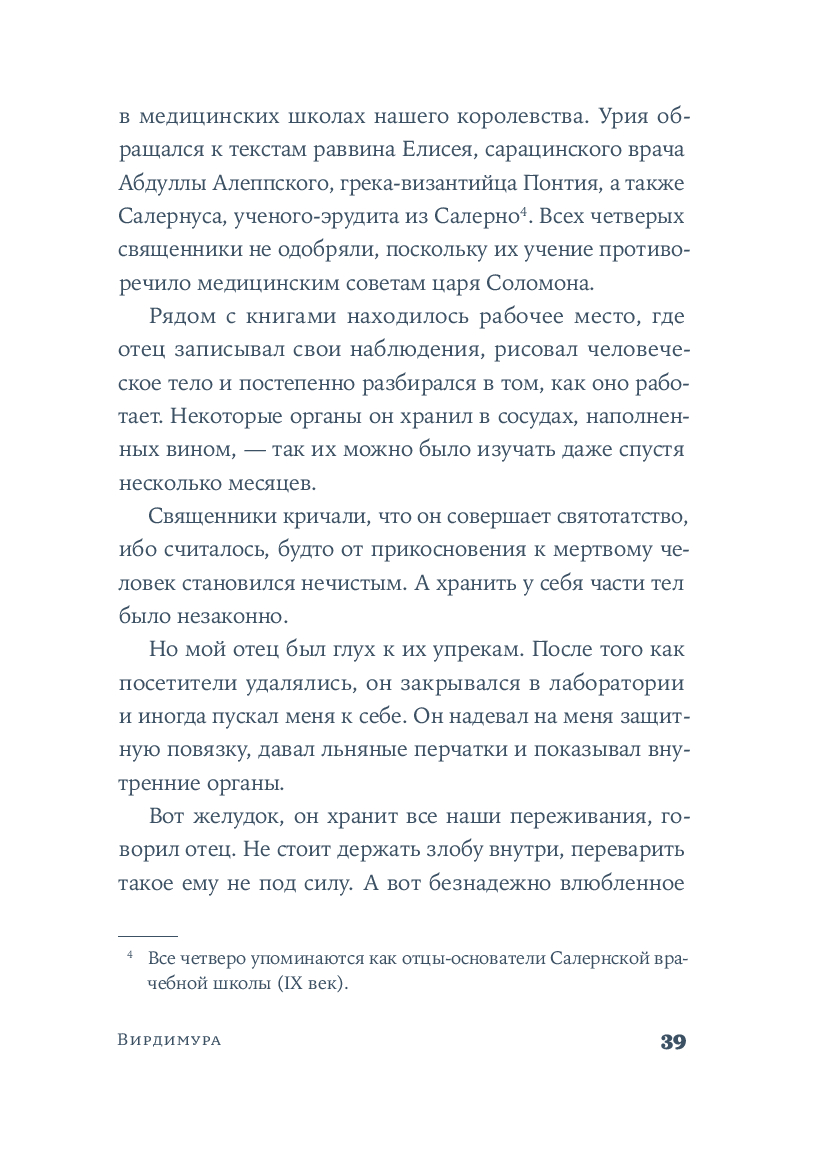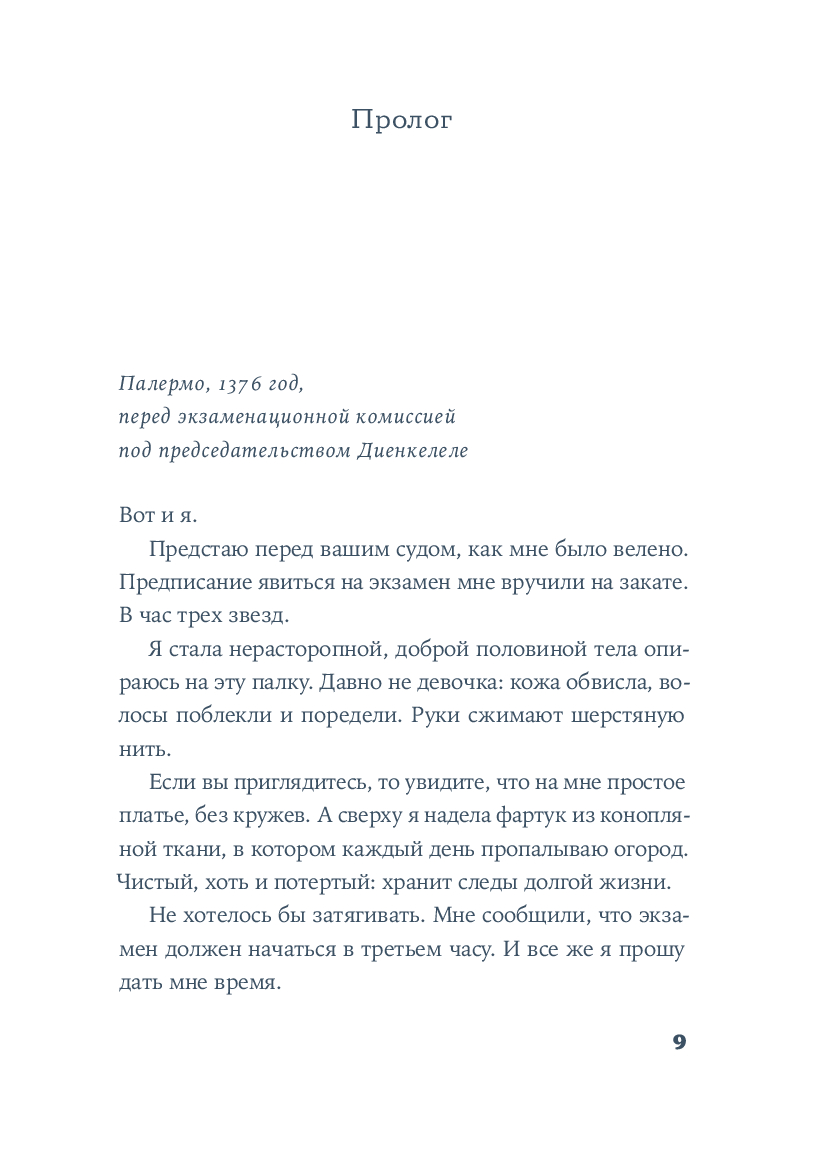 Вирдимура, родившаяся в день дождей и предзнаменований, носит имя мха, упорно появляющегося на городских стенах Катании. Ее воспитывал отец, мастер Урия – врач, владеющий тайнами целебных трав, редкими научными знаниями и многими языками. Он учил Вирдимуру исцелять тела и души, не делая различий между мусульманами, христианами или иудеями. Именно отец передал ей важный секрет: "Медицина не требует мастерства. Лишь навыка". Эти слова Вирдимура на склоне лет повторяет перед комиссией, которая решает, выдать ли женщине, впервые в истории, лицензию на врачевание.