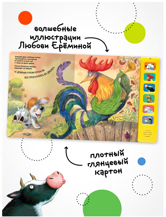 Эта замечательная звуковая книга с волшебными иллюстрациями Л. Ереминой и добрыми стихами обязательно понравится малышу. Вместе с забавным щенком он скажет: "Доброе утро!" – корове, овечке, петуху и другим домашним животным. Нажимая на кнопки, ребенок сможет послушать 6 разных звуков: кукареканье петуха, мычание коровы и другие.