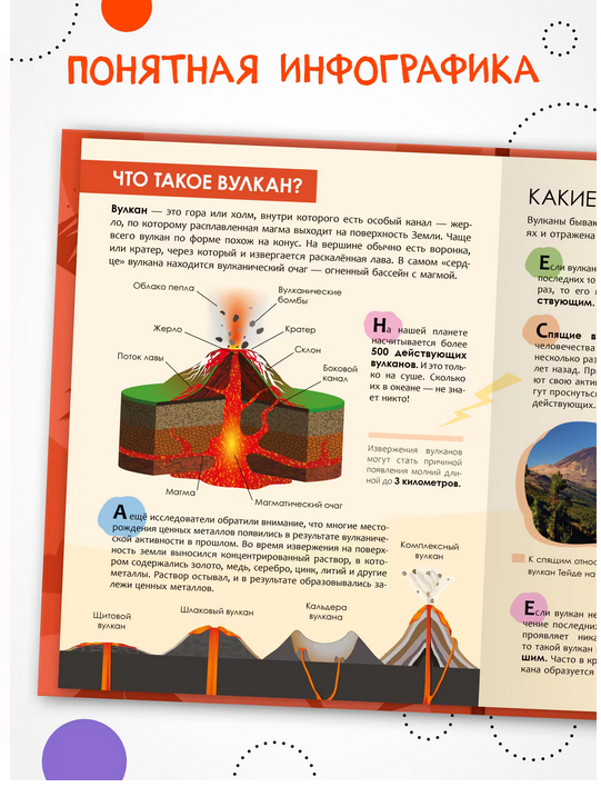 Книга – идеальный подарок для любознательного ребенка. Благодаря этой книжке ребенок сможет поближе познакомиться с устройством земного шара и узнать, какие вулканы существуют на Земле и других планетах, что такое гейзеры и почему землетрясения тесно связаны с вулканами. Интересные факты проиллюстрированы яркими фотографиями и понятной инфографикой, которые помогут полностью погрузиться в изучение предмета и узнать новое об окружающем мире.