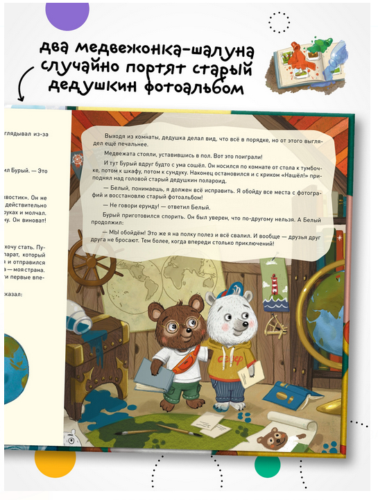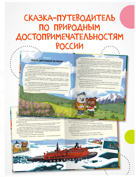 Удивительная сказка-путеводитель по природным достопримечательностям России. Два медвежонка-шалуна случайно портят старый дедушкин фотоальбом. Но это не просто фотографии, а настоящая история первого путешествия дедушки по России. Давным-давно совсем юным он с фотоаппаратом наперевес изучил самые отдаленные уголки нашей страны – Байкал и Камчатку, забрался на Эльбрус и побывал на Земле Франца-Иосифа. Как же исправить шалость? Медвежата решают повторить дедушкин маршрут. Их ждут невероятные приключения, новые знакомства и удивительные открытия. Скорее открывайте книгу: путешествие начинается!