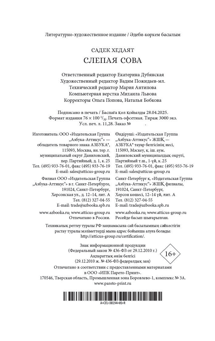 "Слепая сова" – opus magnum в творчестве выдающегося иранского писателя Садека Хедаята. Автор начал эту повесть еще в дни своей учебы во Франции, а закончил и опубликовал в Индии, спустя почти десять лет. Сюрреалистическое повествование о художнике с разбитым сердцем, которого во снах преследует тень совы и в чью реальность проникают странные люди, будто посланцы с того света, – женщина с бездонными глазами и старый дервиш с лающим смехом... "Слепая сова" быстро завоевала признание в литературных кругах Европы и стала лучшим произведением иранской литературы XX века.
