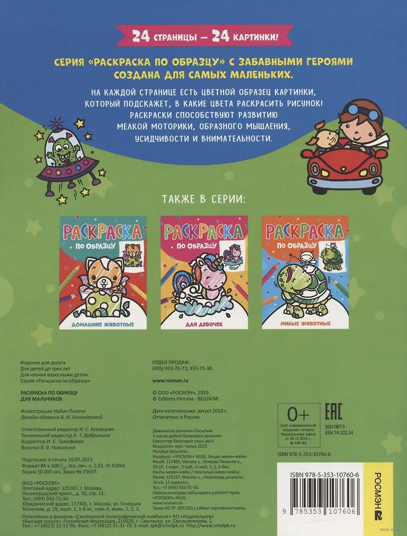 Серия "Раскраска по образцу" с забавными героями создана для самых маленьких. На каждой странице есть цветной образец картинки, который подскажет, в какие цвета раскрасить рисунок! Раскраски способствуют развитию мелкой моторики, образного мышления, усидчивости и внимательности.