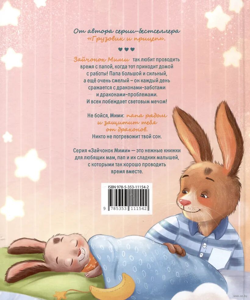 Зайчонок Мими так любит проводить время с папой, когда тот приходит домой с работы! Папа большой и сильный, а еще очень смелый – он каждый день сражается с драконами-заботами и драконами-проблемами. И всех побеждает световым мечом!