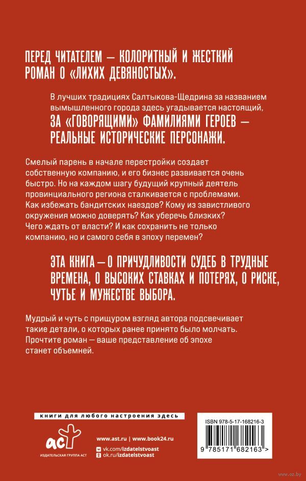 Перед читателем – колоритный и жесткий роман о "лихих девяностых". В лучших традициях Салтыкова-Щедрина за названием вымышленного города здесь угадывается настоящий, за "говорящими" фамилиями героев – реальные исторические персонажи.