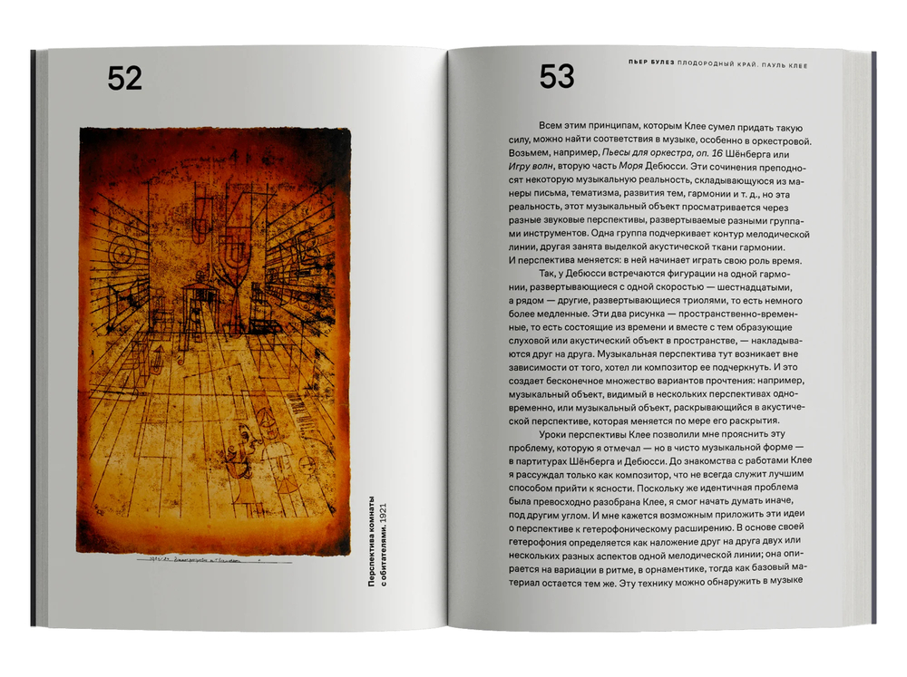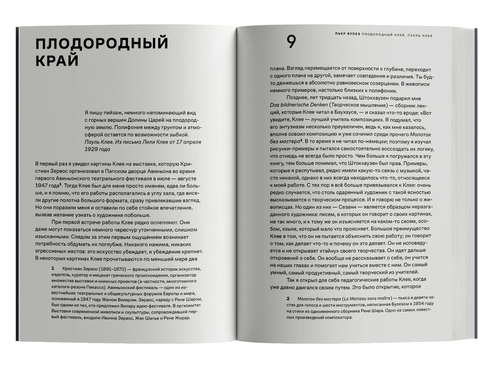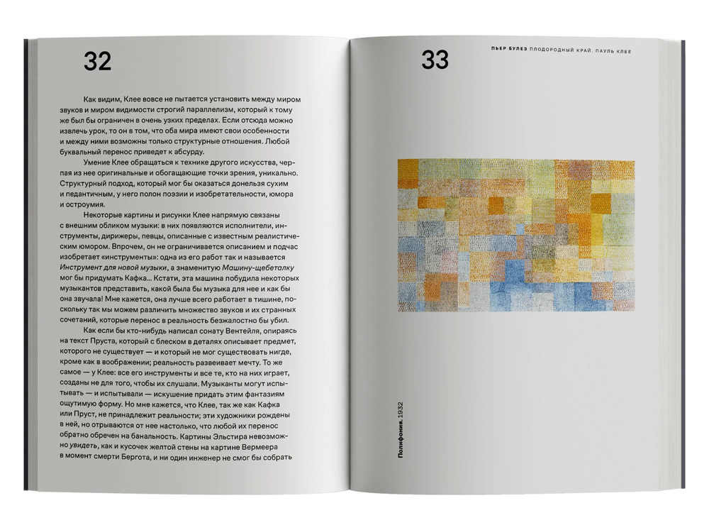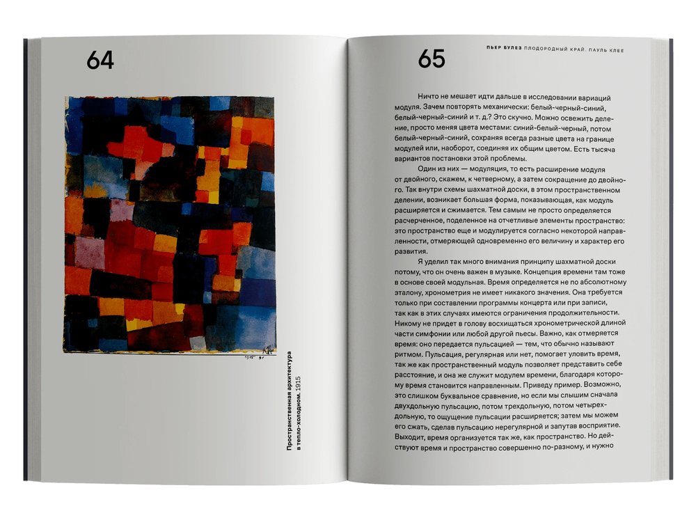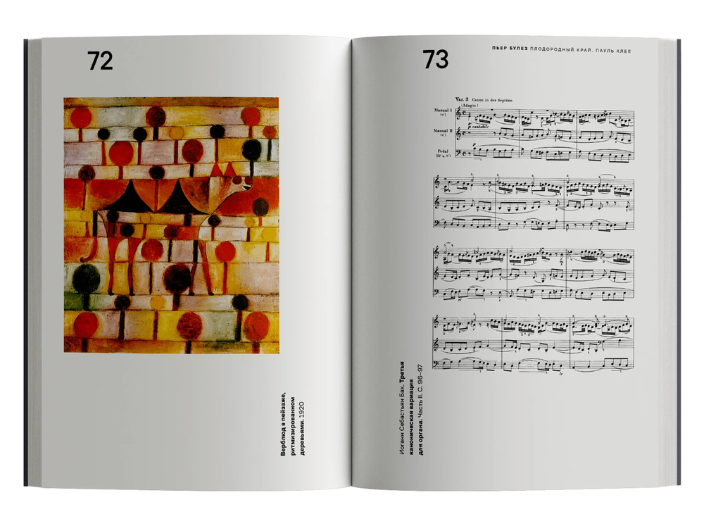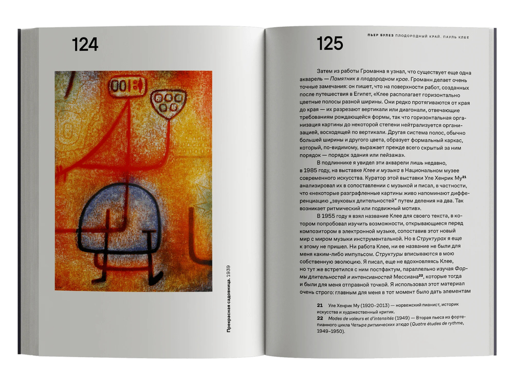Булез, в свою очередь, находит в искусстве и теории Клее опору для изучения структуры и ритма в музыке. Этот непрерывный обмен, переход между музыкой, живописью и литературой, а также теоретической строгостью и экспрессивным вдохновением становится, по мысли Булеза, плодородным краем любого творчества.