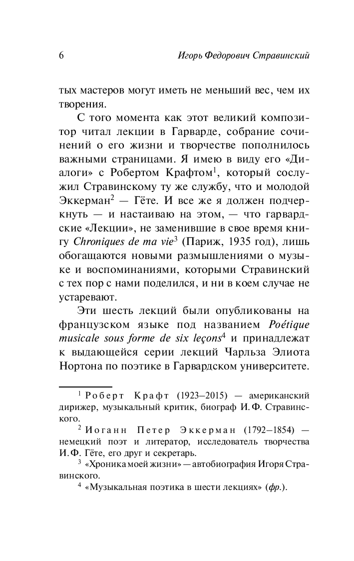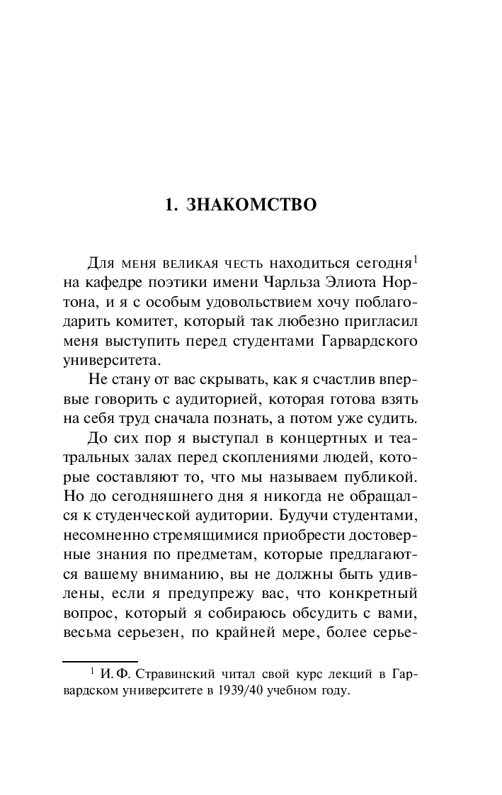 Книга представляет собой цикл лекций по музыкальной поэтике, прочитанных Игорем Стравинским в Гарвардском университете в 1939–1940 гг.